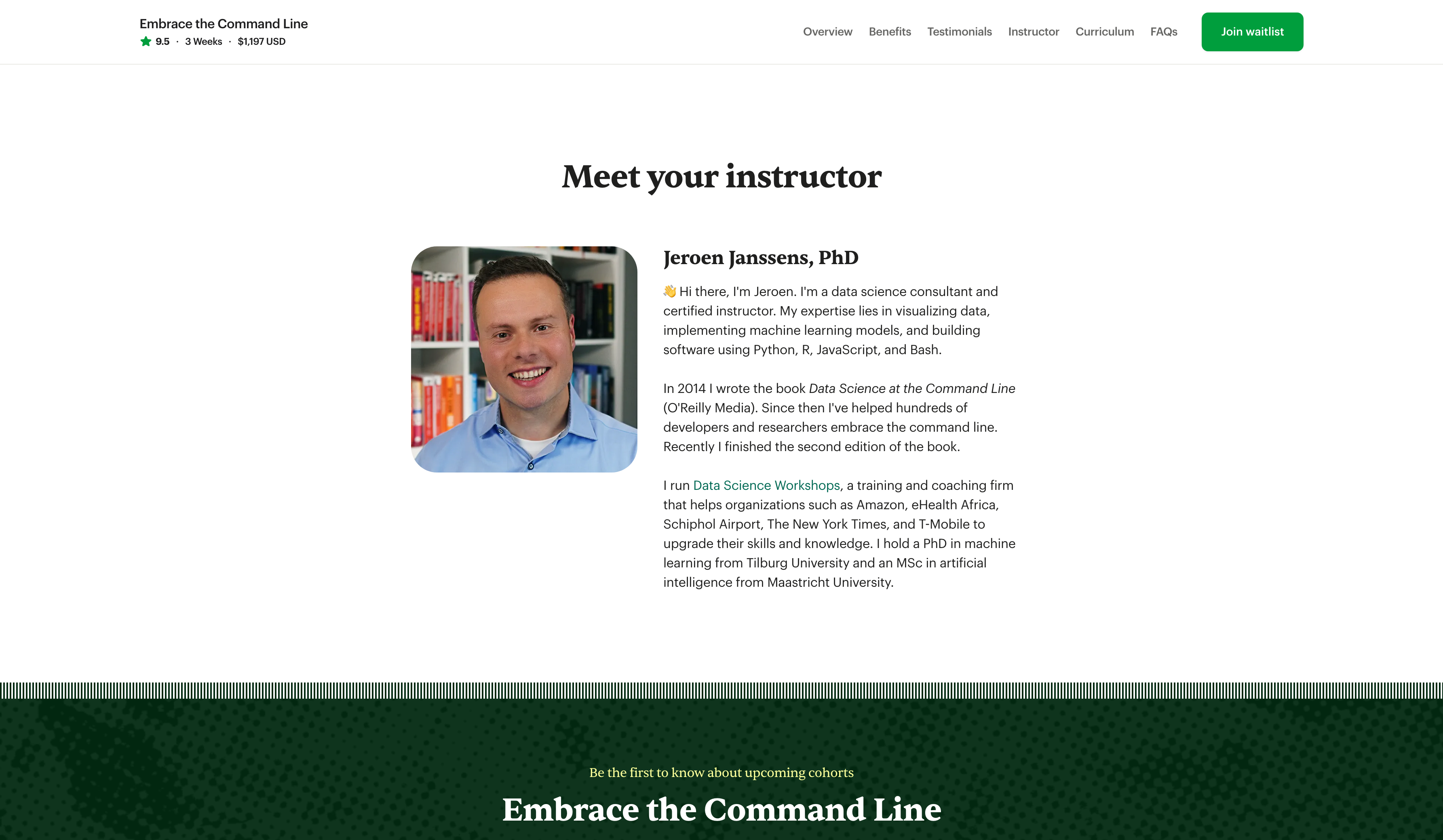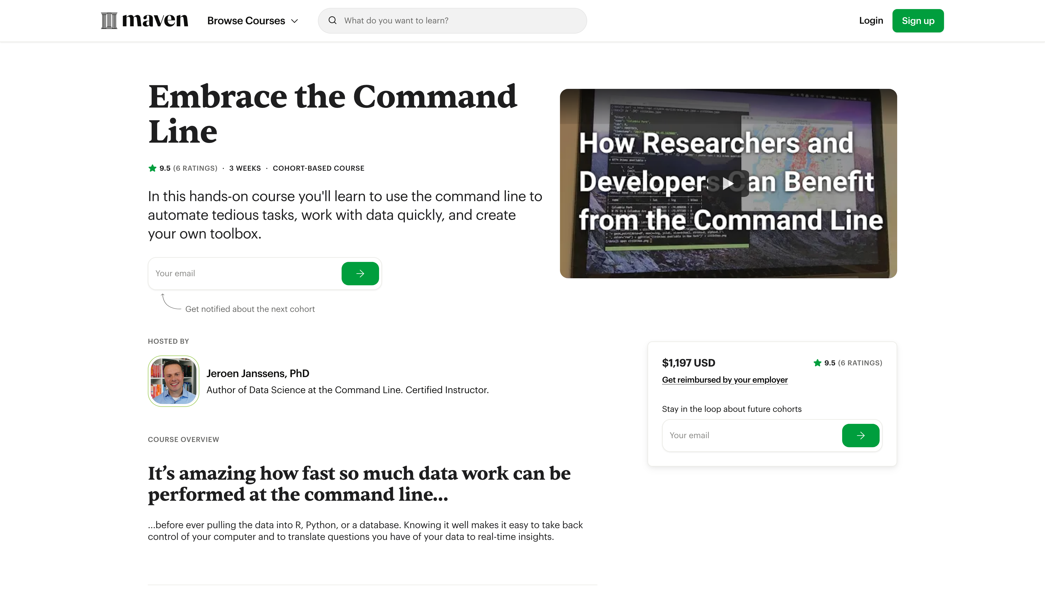 Embrace the Command Line was a three-week cohort-based course, created to help developers and researchers getting started with the command line. It was roughly based on my book Data Science at the Command Line.
