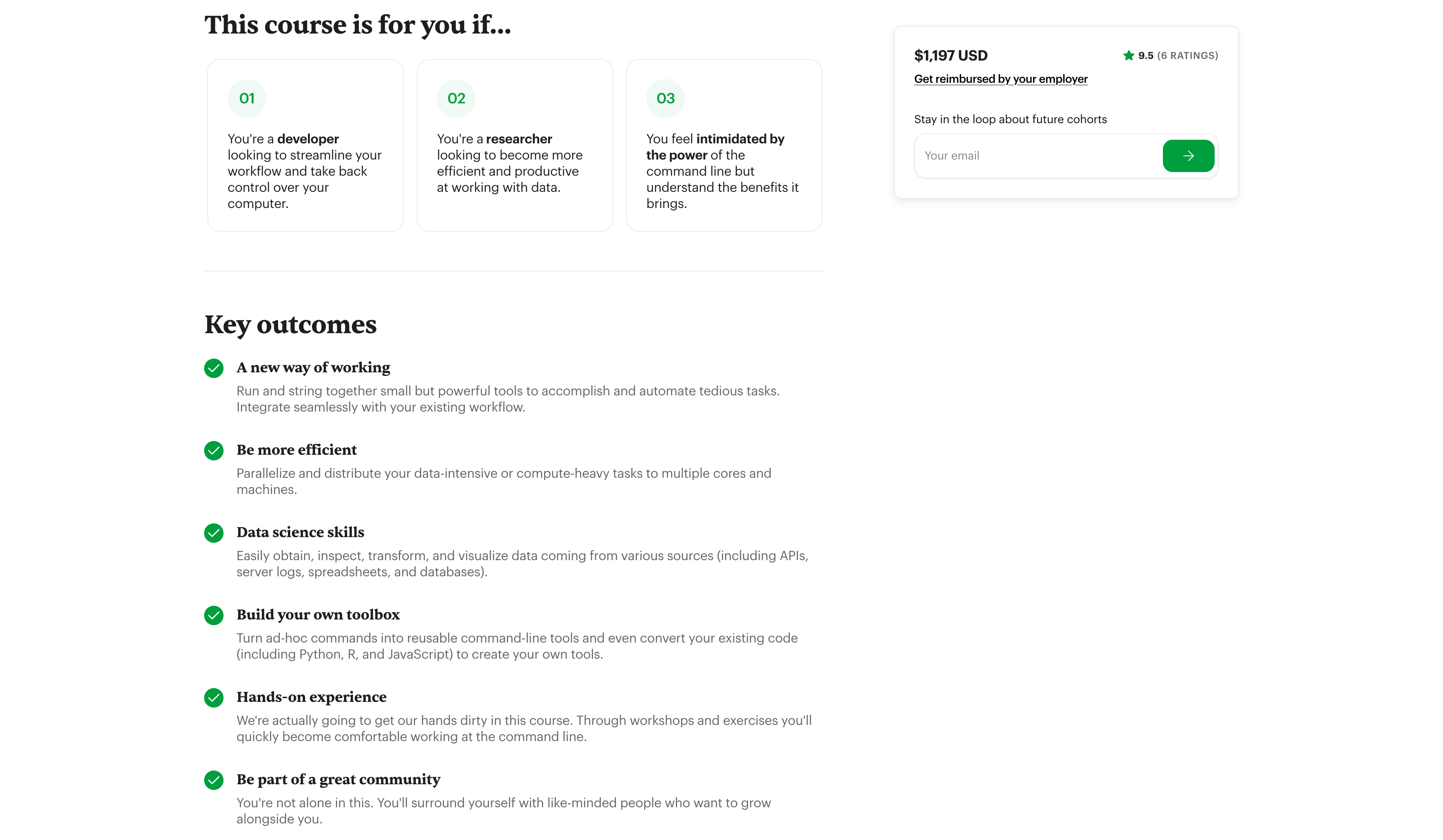 This course is for you if… You’re a developer looking to streamline your workflow and take back control over your computer. You’re a researcher looking to become more efficient and productive at working with data. You feel intimidated by the power of the command line but understand the benefits it brings.