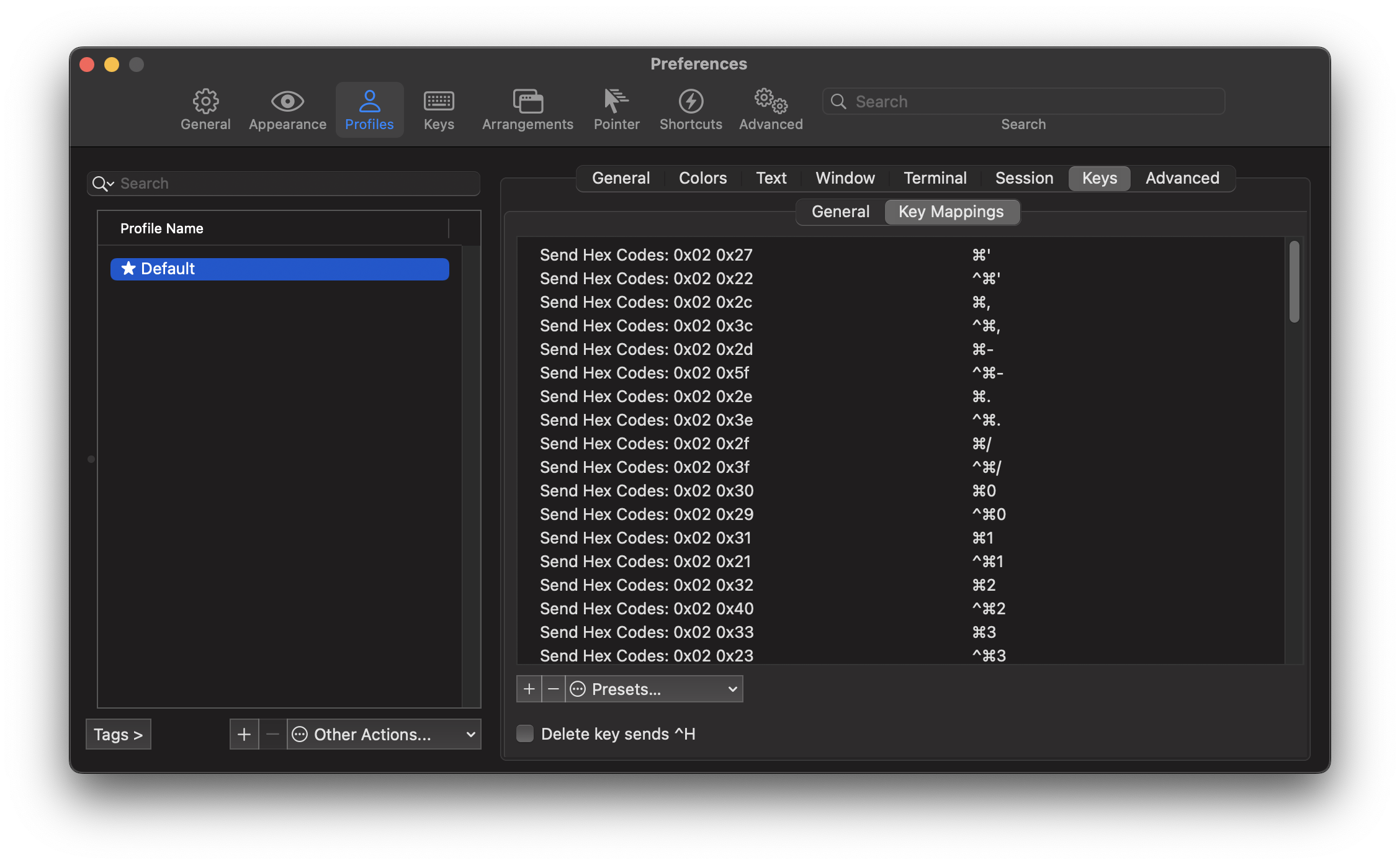Fortunately, iTerm, which is the terminal emulator that I use on macOS, has the ability to define key mappings. This allows you to simulate, say, Ctrl-B J by pressing Cmd-J.[1] Defining these key mappings manually, however, turns out to be a tedious and error-prone task.