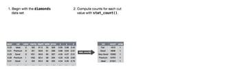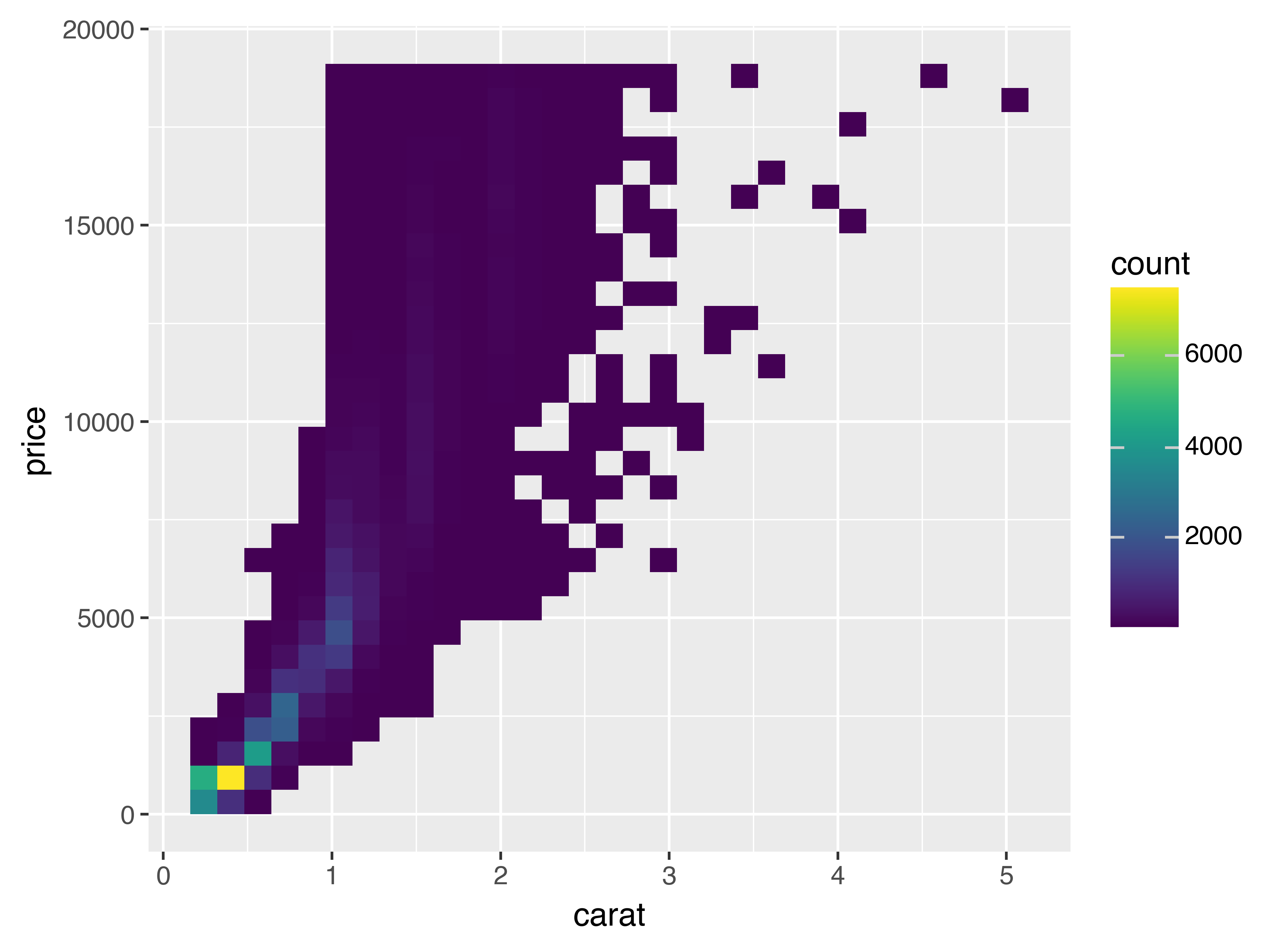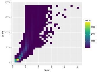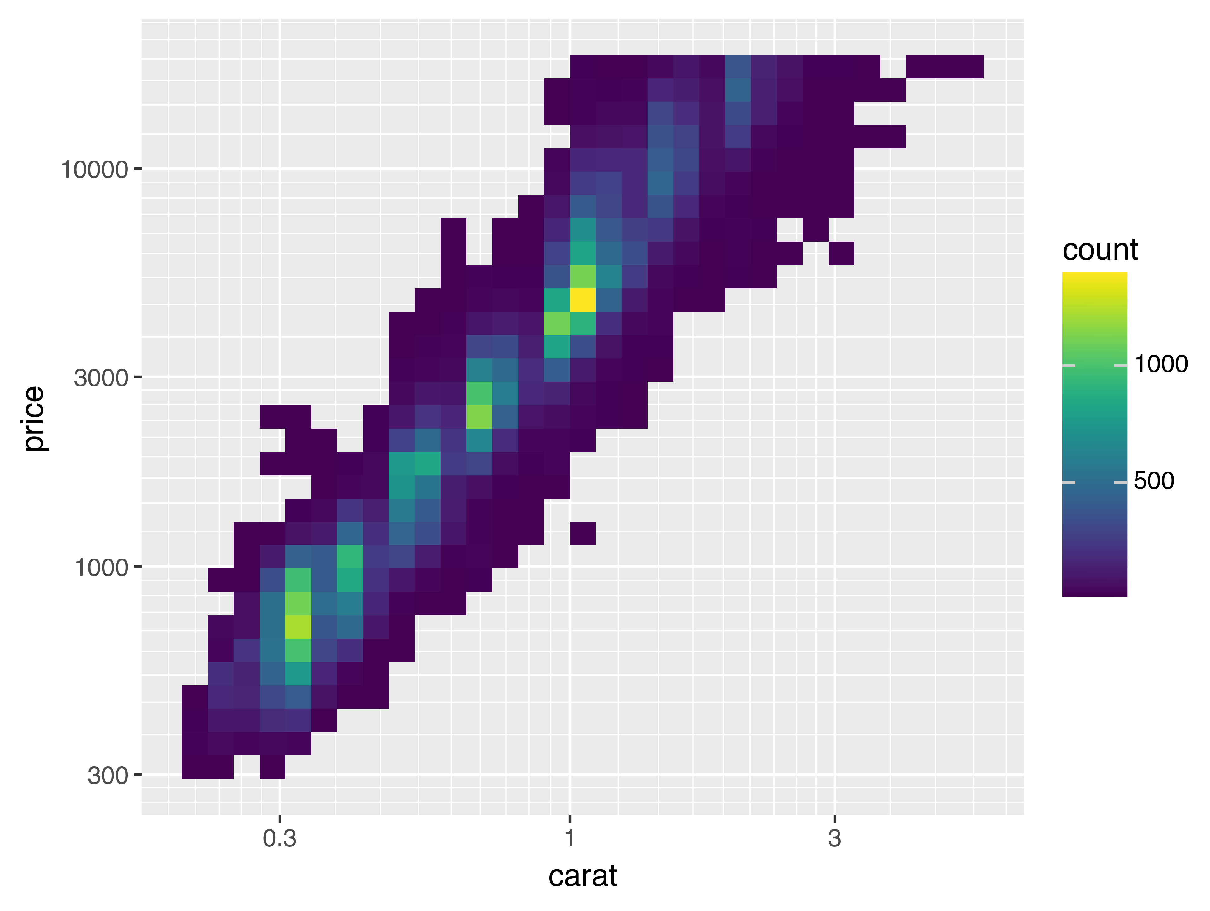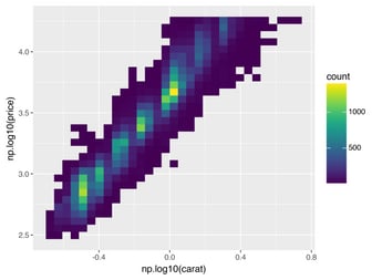 It’s very useful to plot transformations of your variable. For example, with the diamonds DataFrame, it’s easier to see the precise relationship between carat and price if we log transform them: