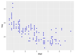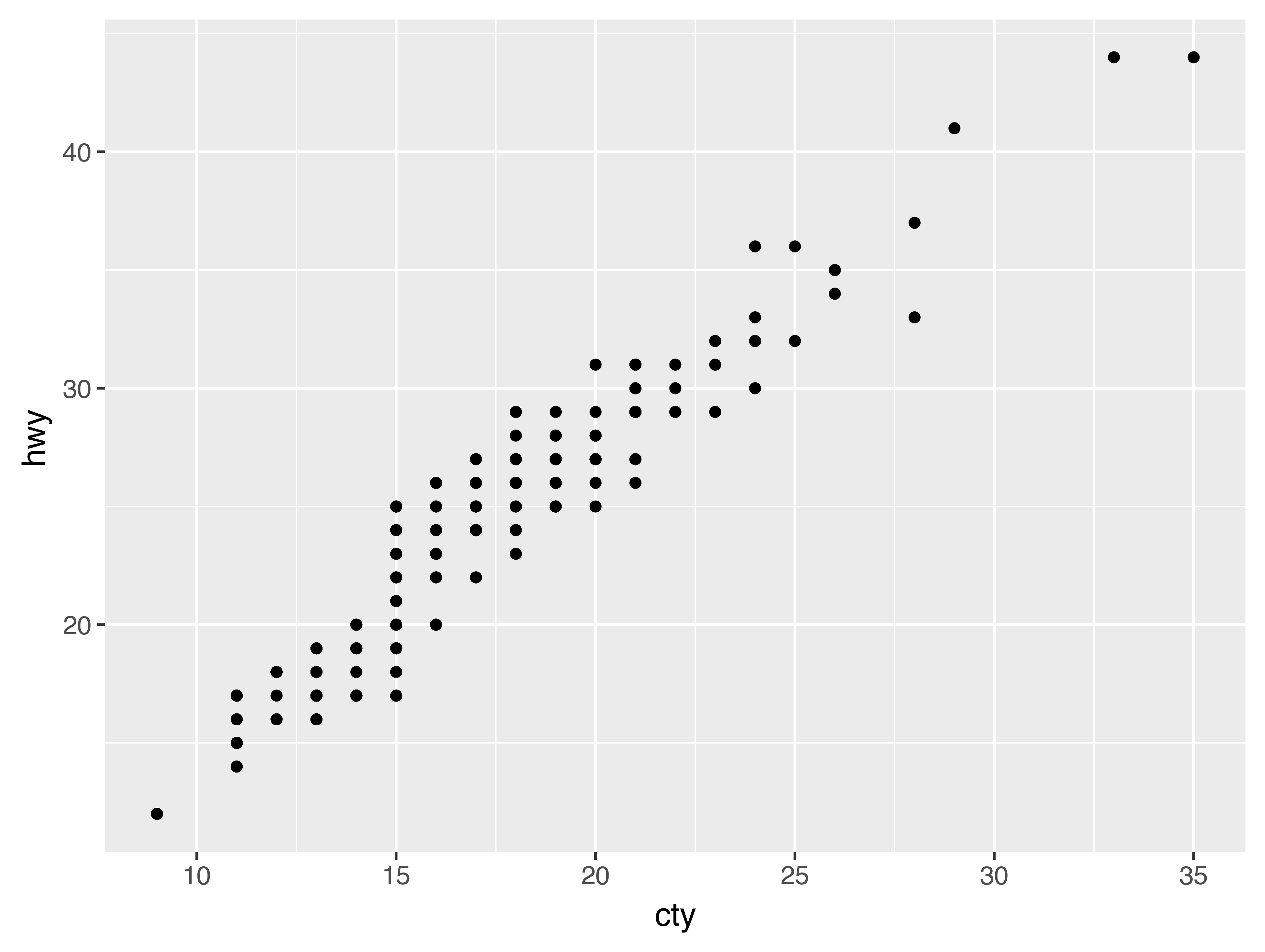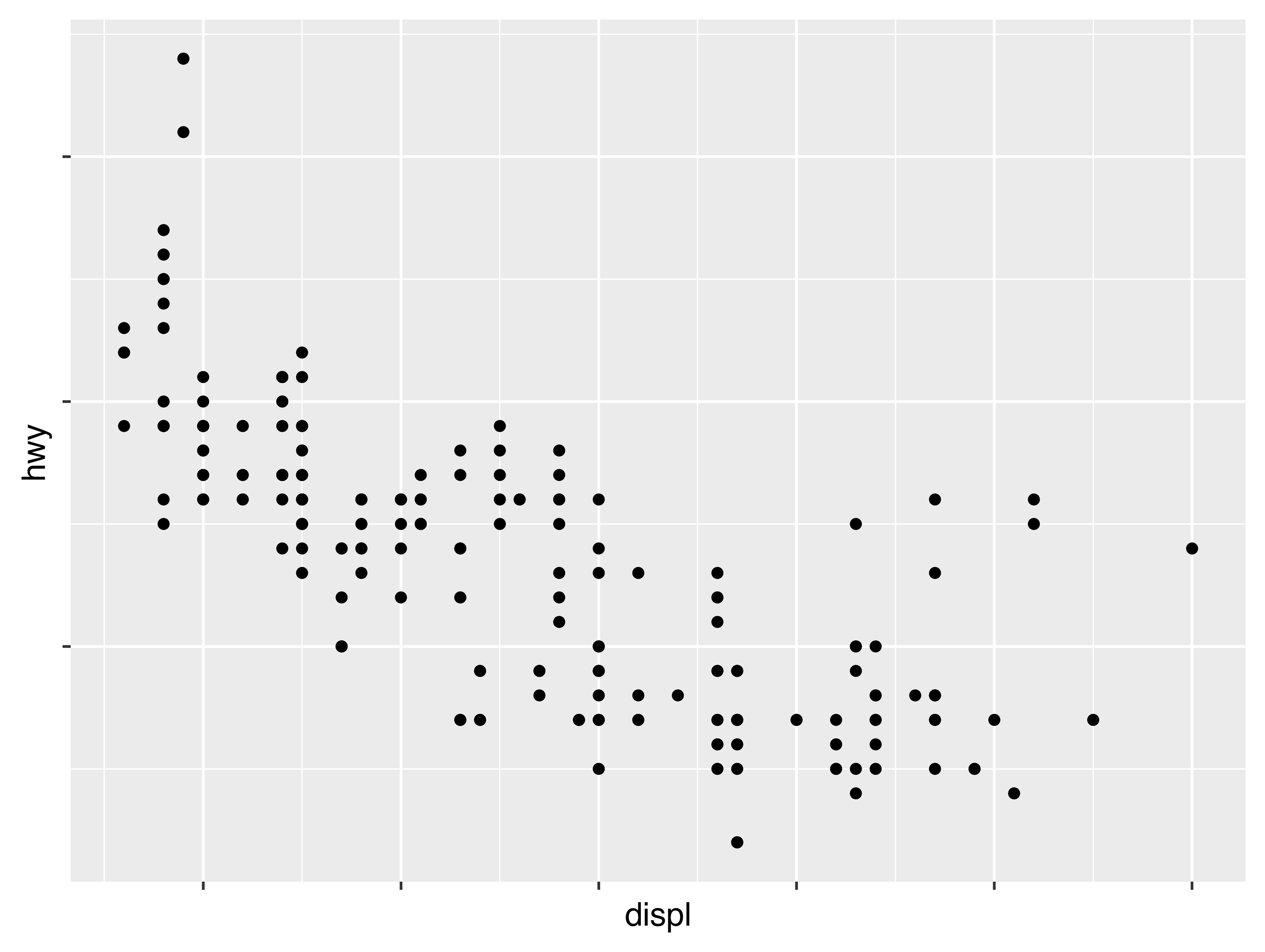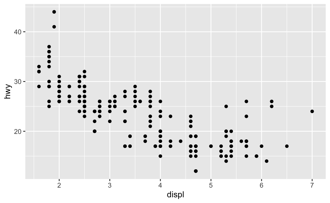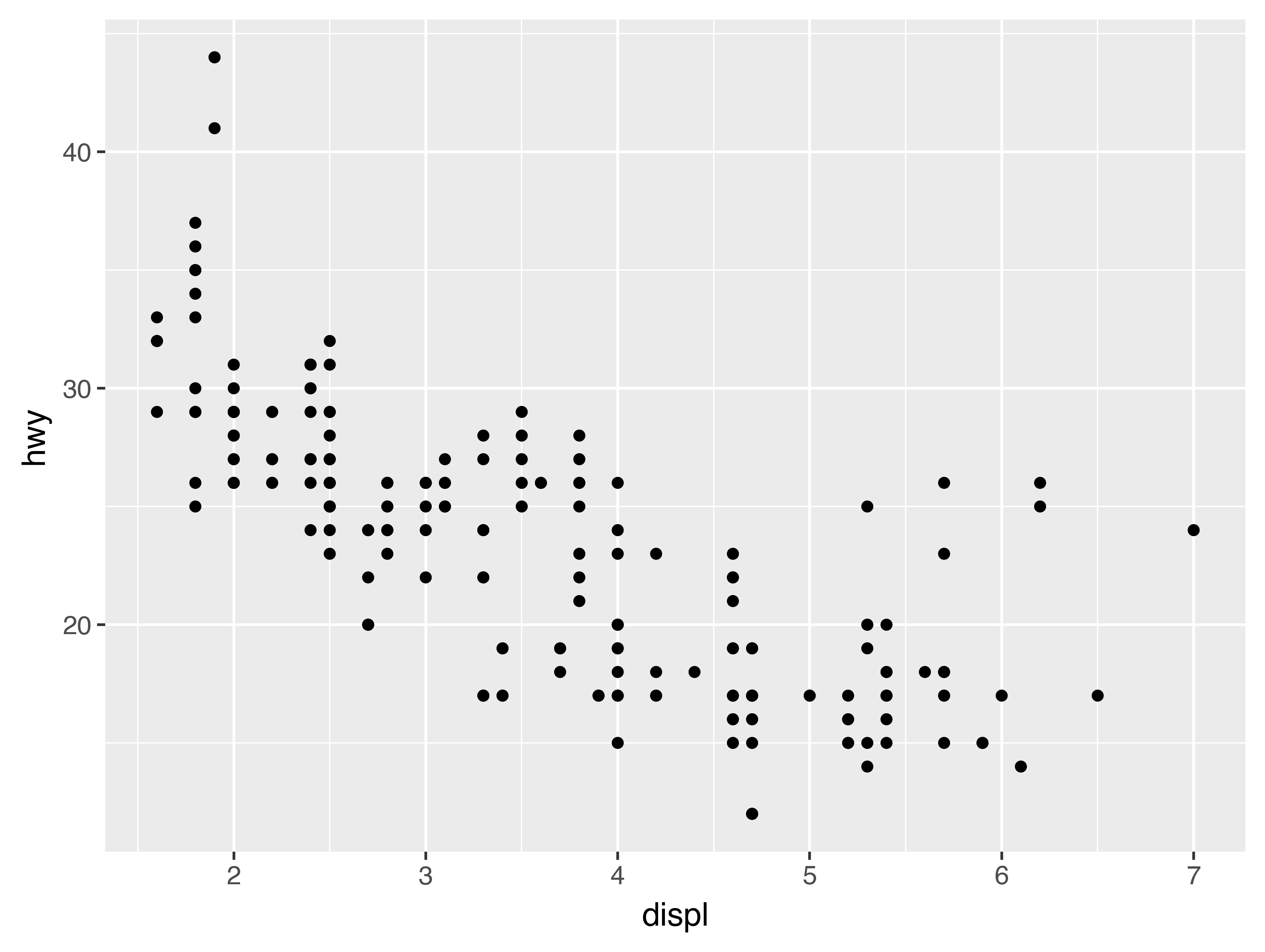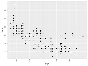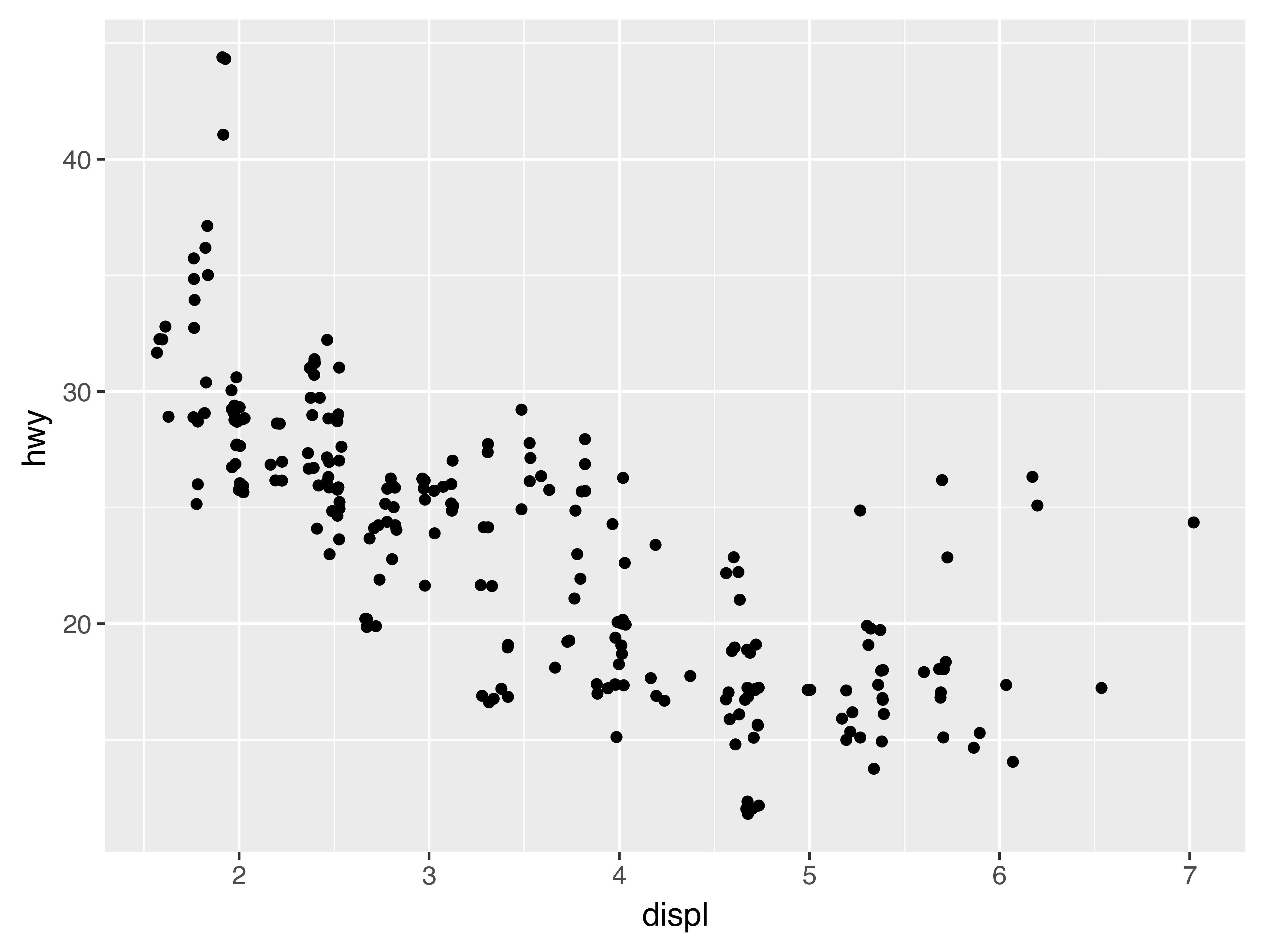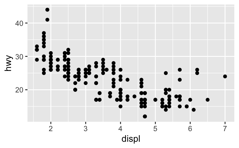 ggplot(mpg, aes("displ", "hwy")) + geom_point()