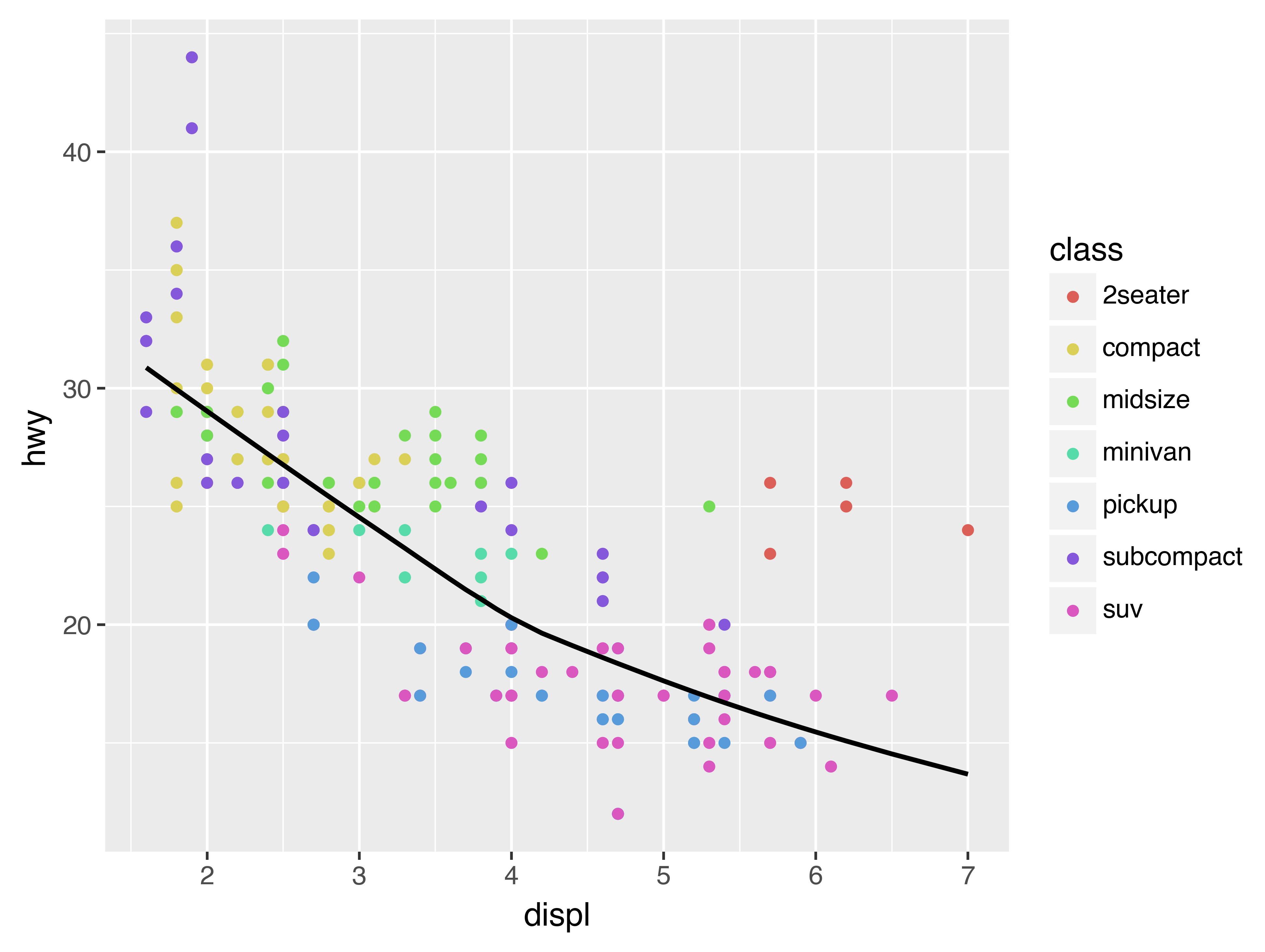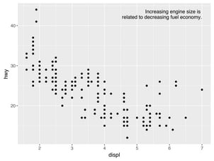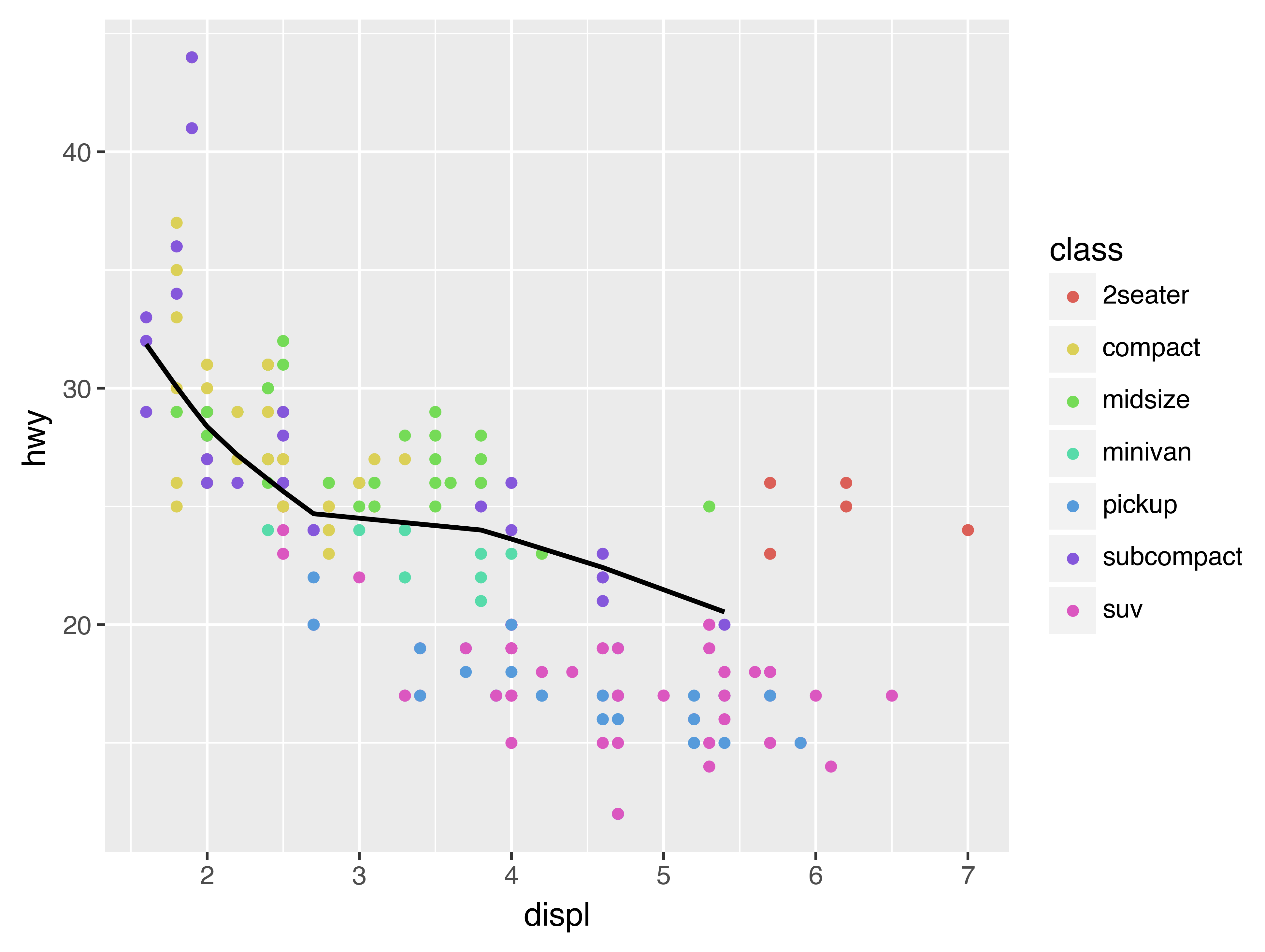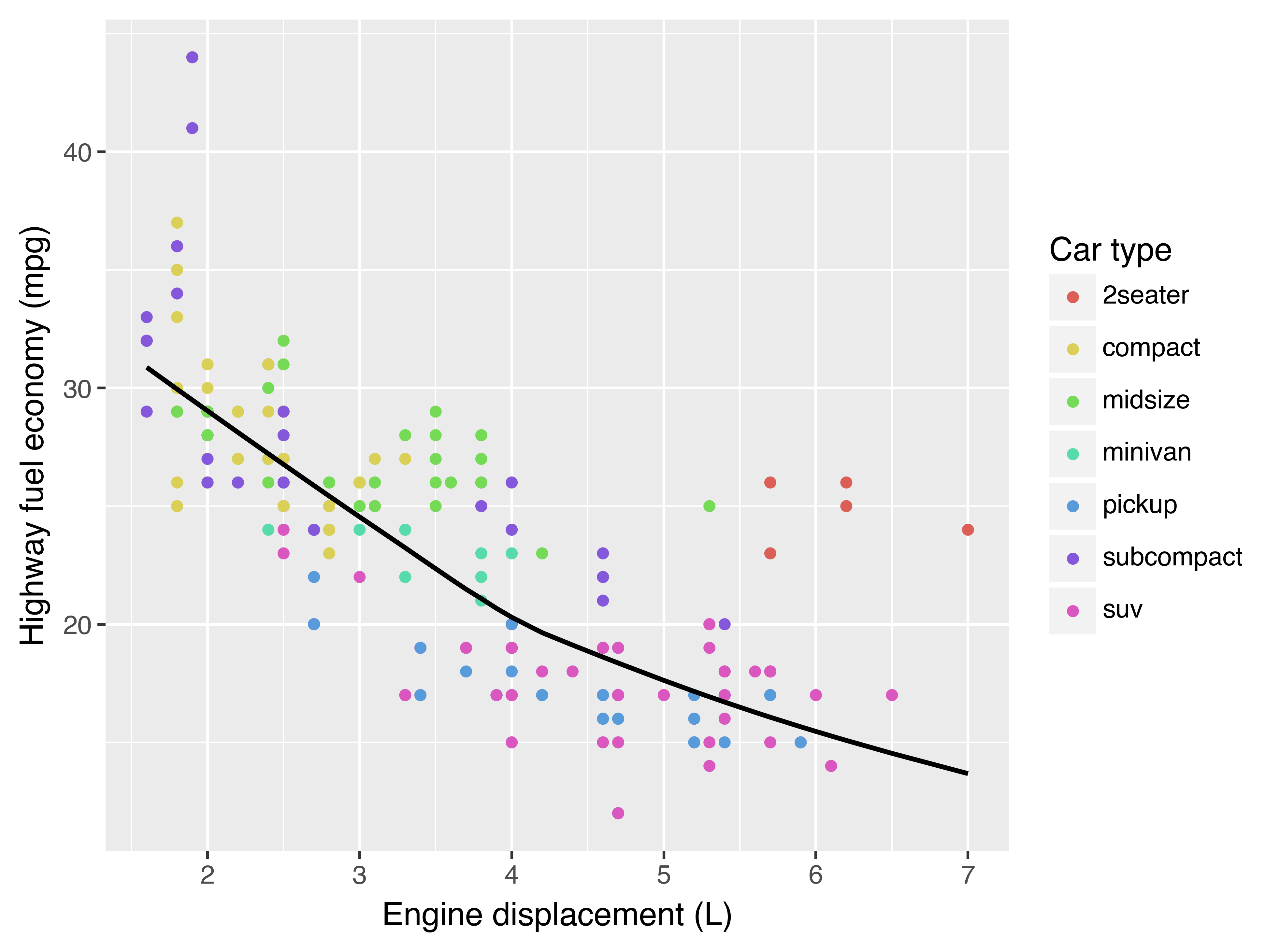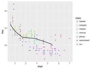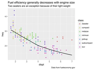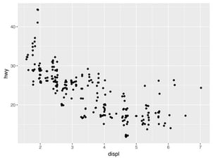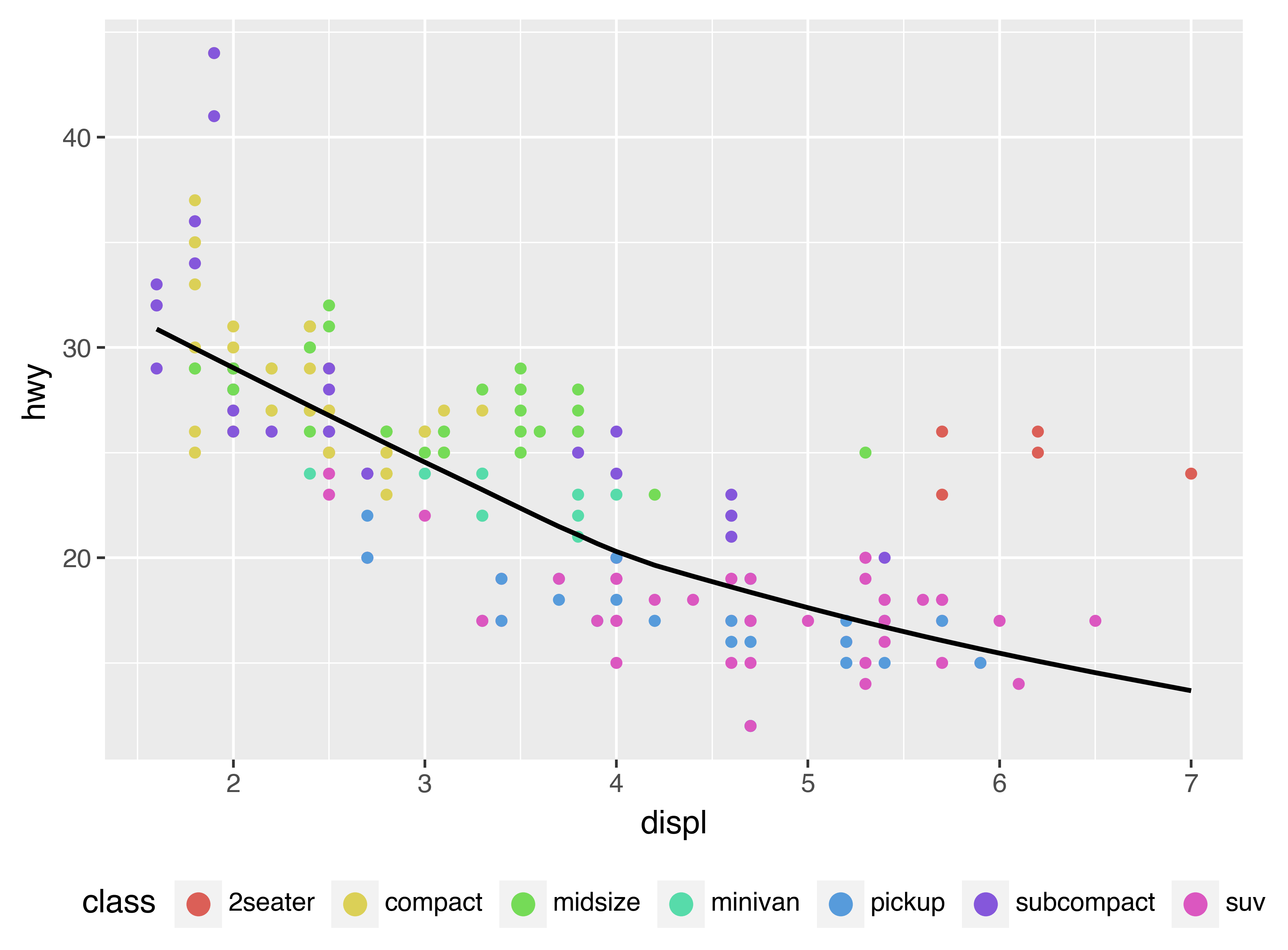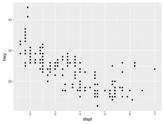 The plot shows a negative relationship between engine size (displ) and fuel efficiency (hwy). In other words, cars with big engines use more fuel. Does this confirm or refute your hypothesis about fuel efficiency and engine size?