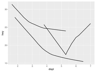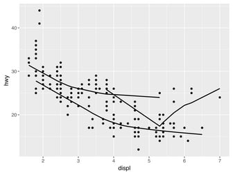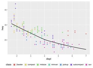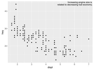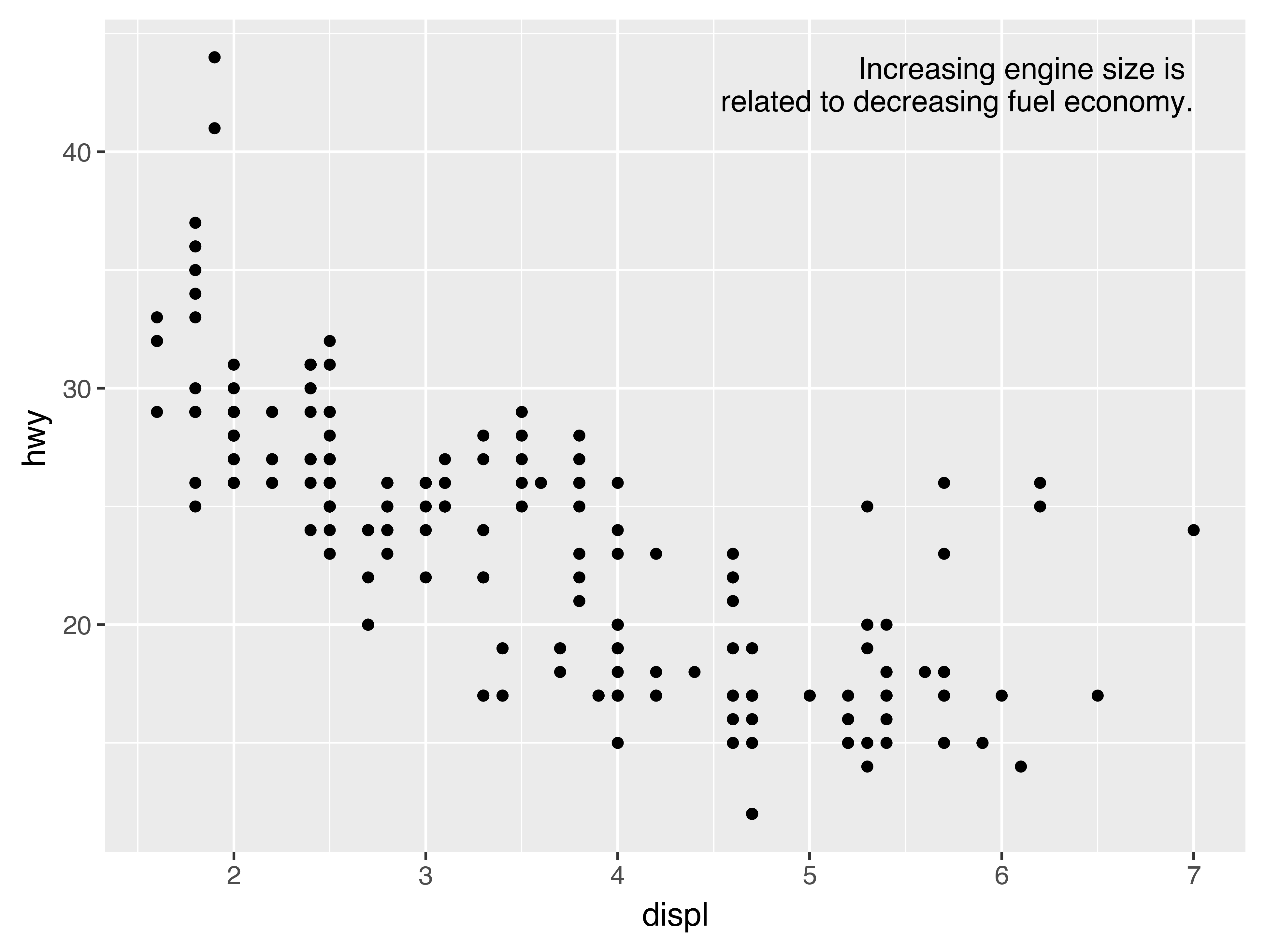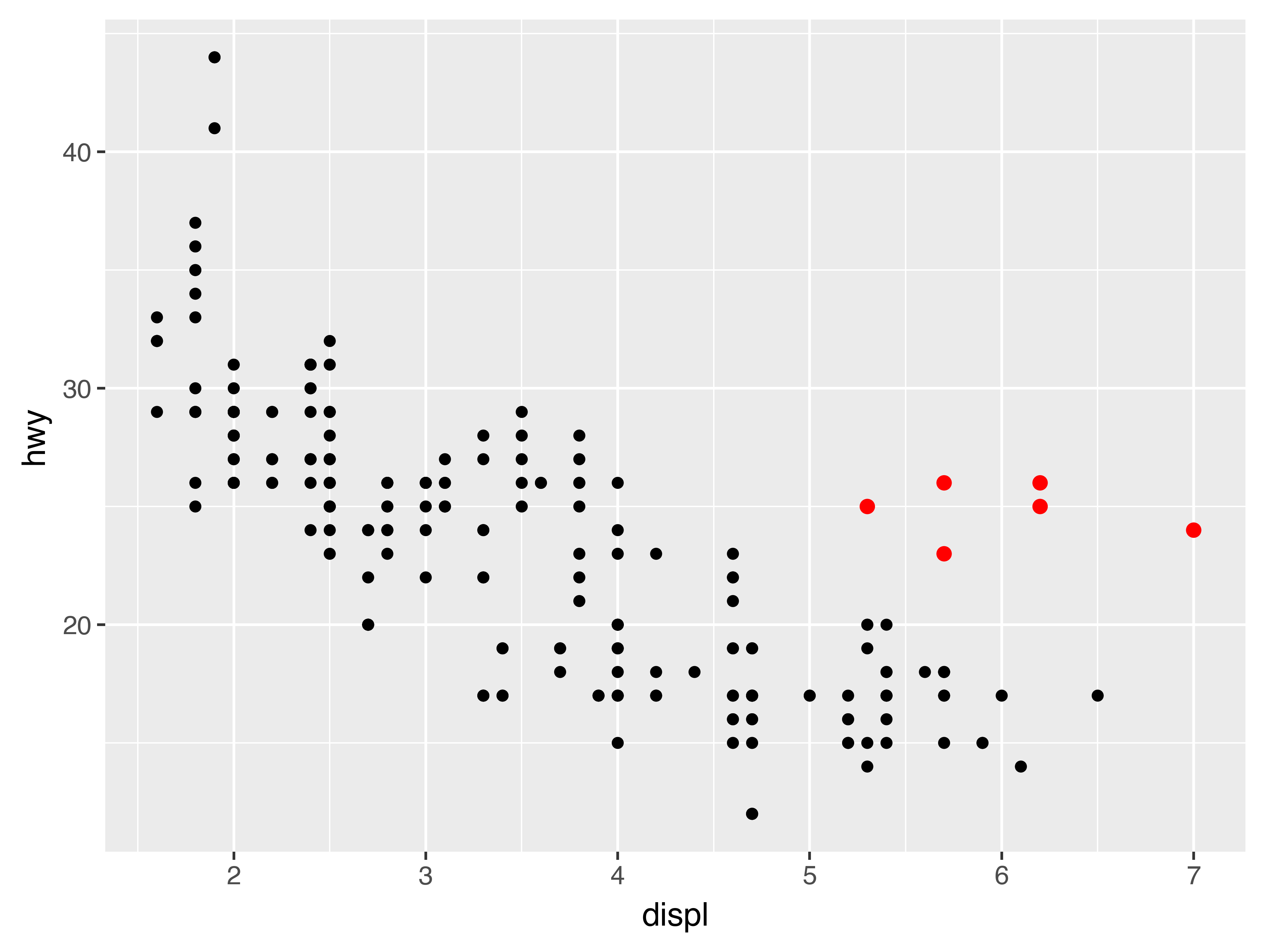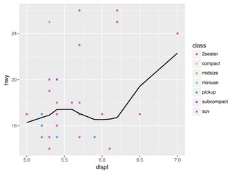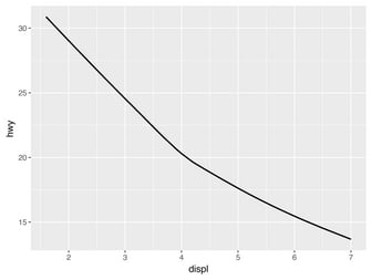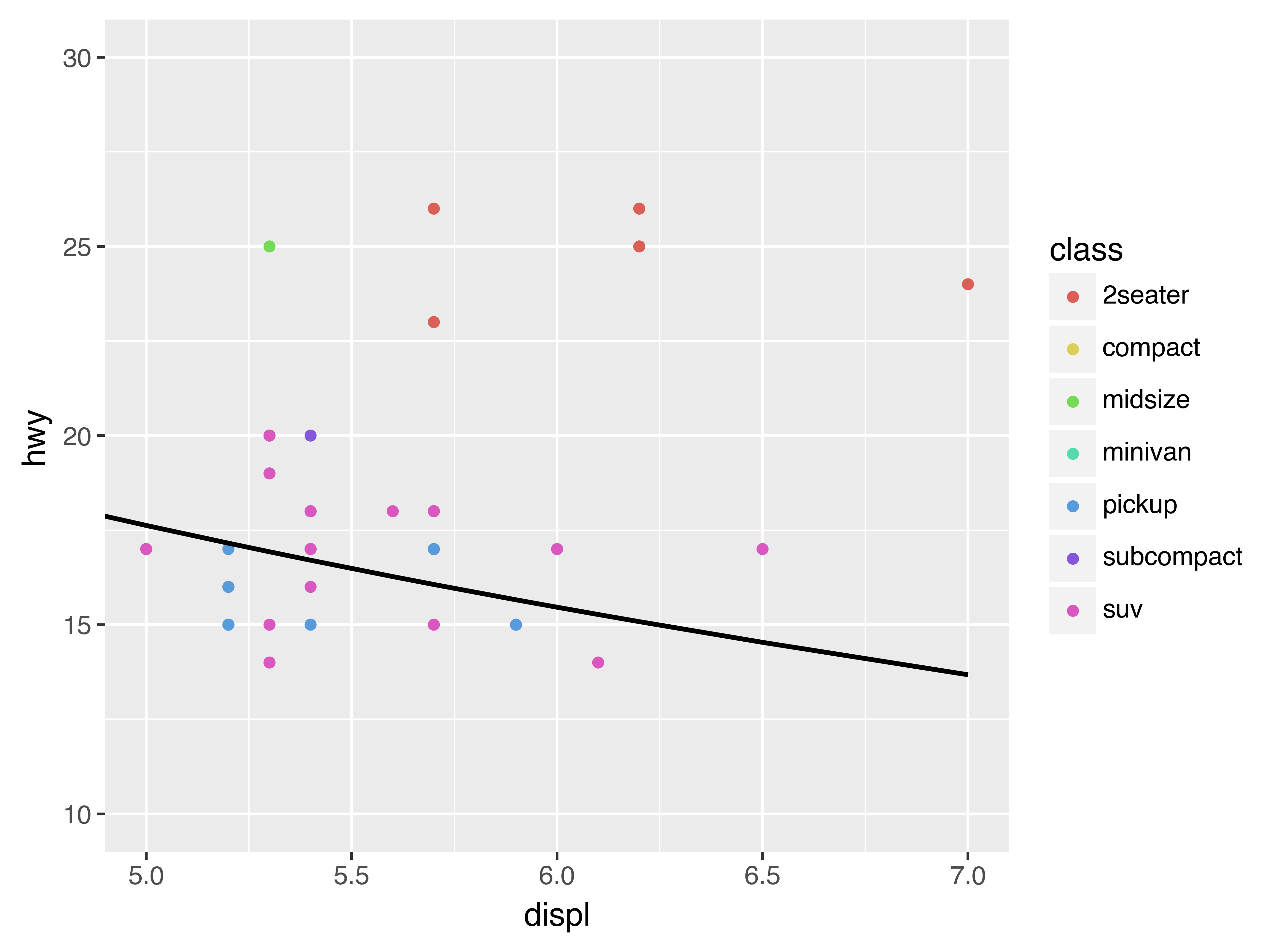 The plot shows a negative relationship between engine size (displ) and fuel efficiency (hwy). In other words, cars with big engines use more fuel. Does this confirm or refute your hypothesis about fuel efficiency and engine size?