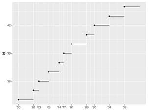 If you find that you’re having to squint to read the text in your plot, you need to tweak width and height. If the width is larger than the size the figure is rendered in the final doc, the text will be too small; if width is smaller, the text will be too big. You’ll often need to do a little experimentation to figure out the right ratio between the width and the eventual width in your document. To illustrate the principle, the following three plots have width of 4, 6, and 8 respectively (and a height which is 0.618 times the width, i.e., the golden ratio):