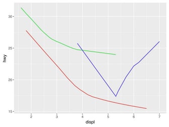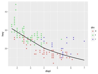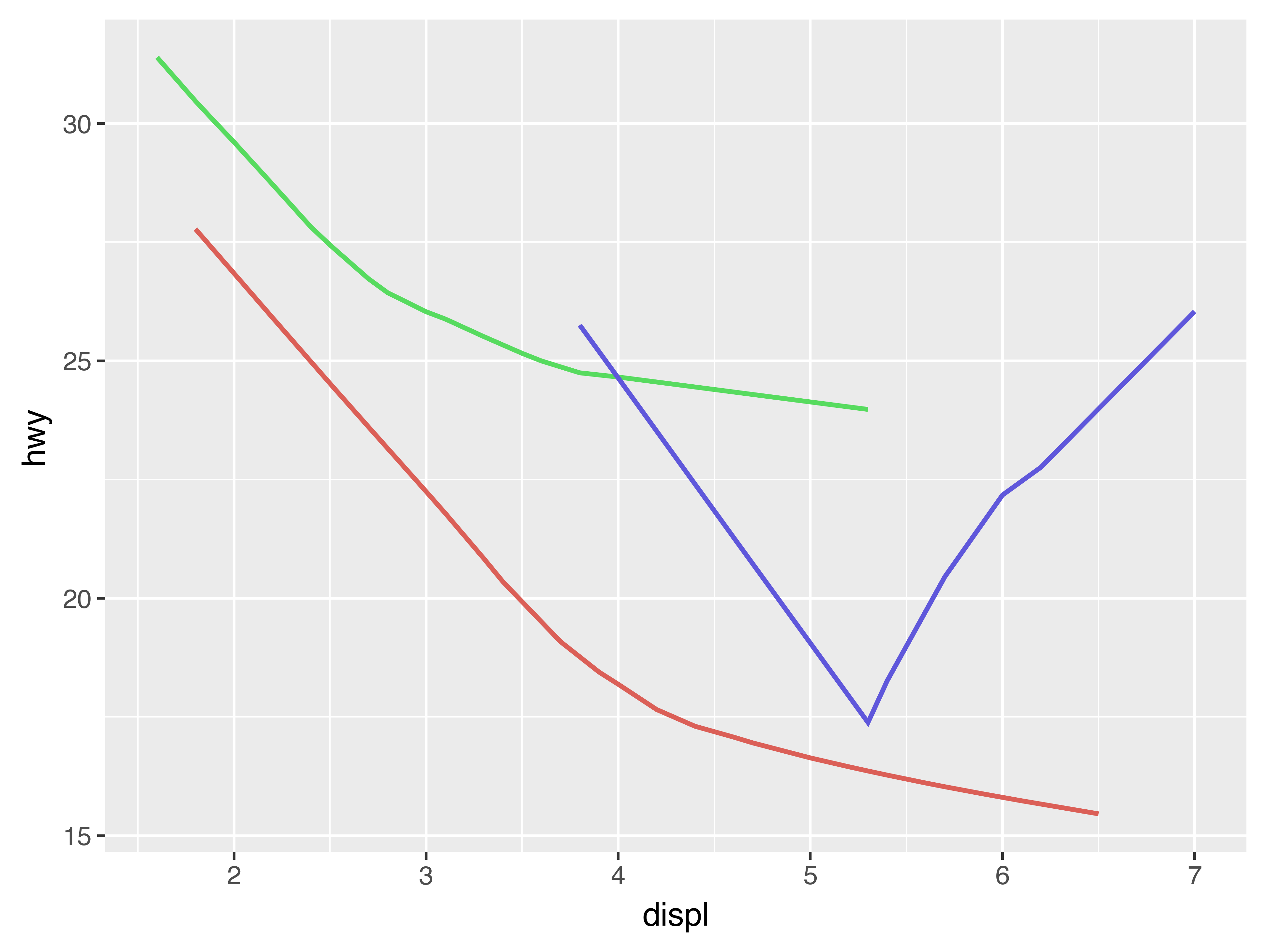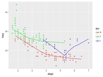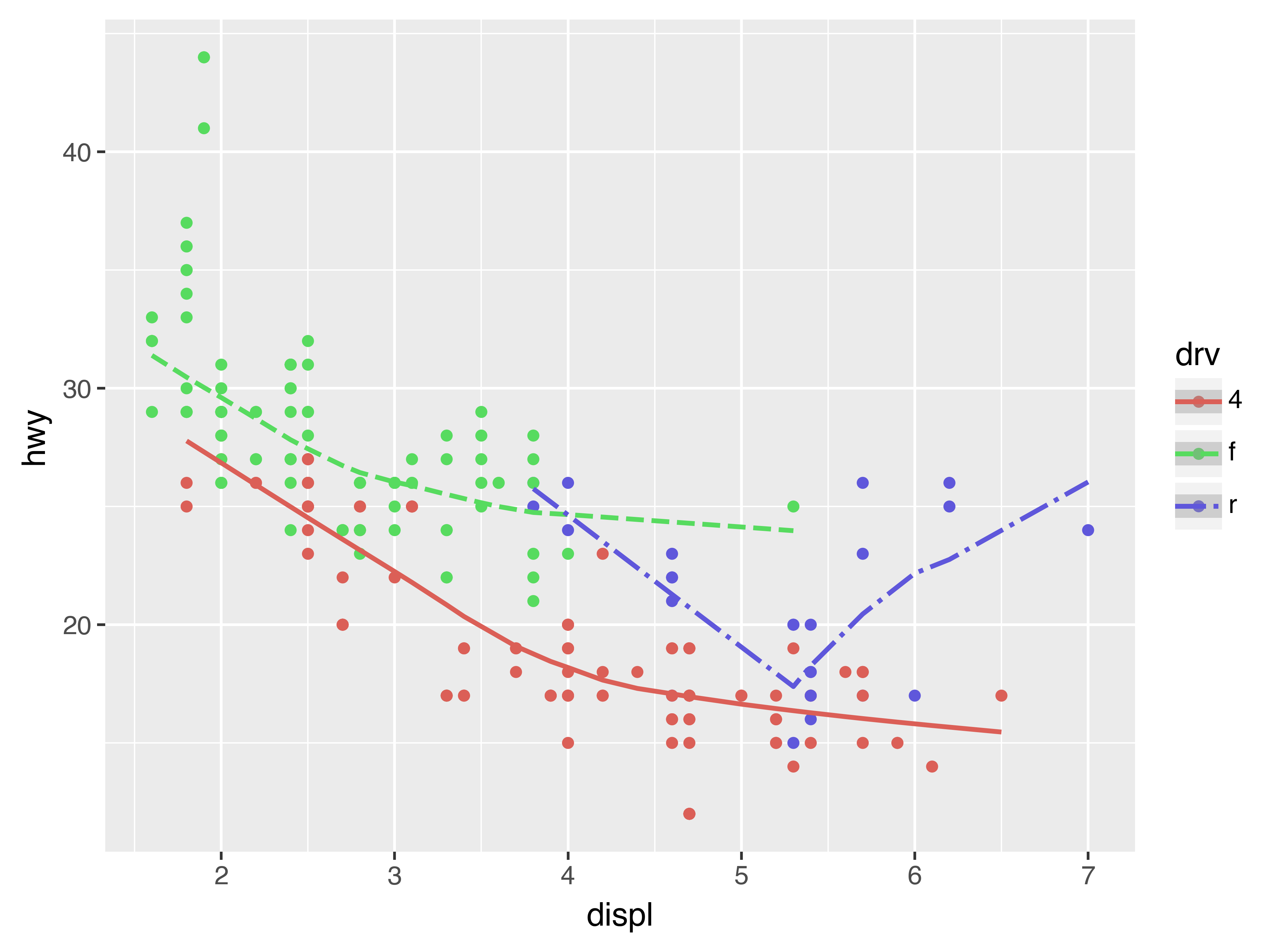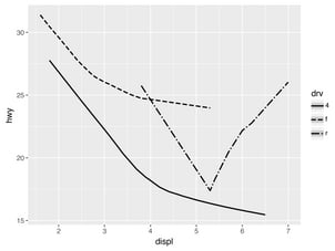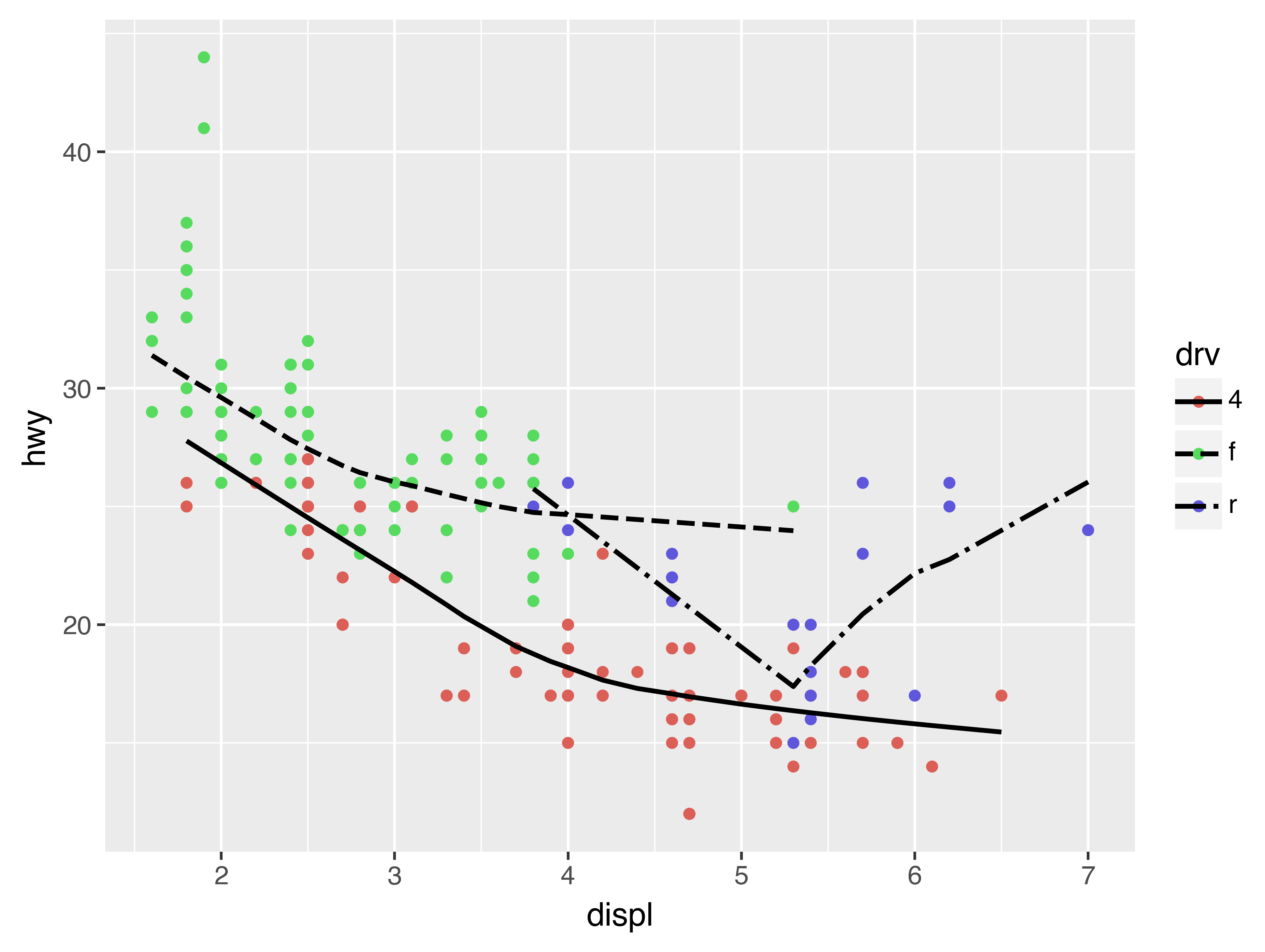 ggplot(suv, aes("displ", "hwy", colour="drv"))