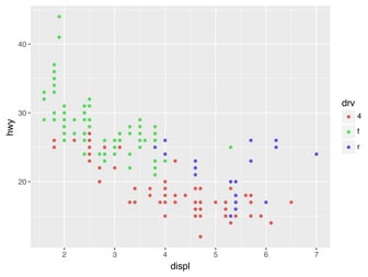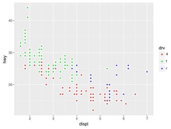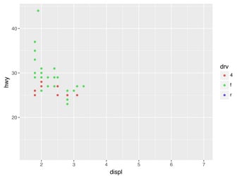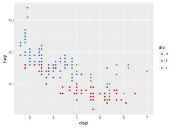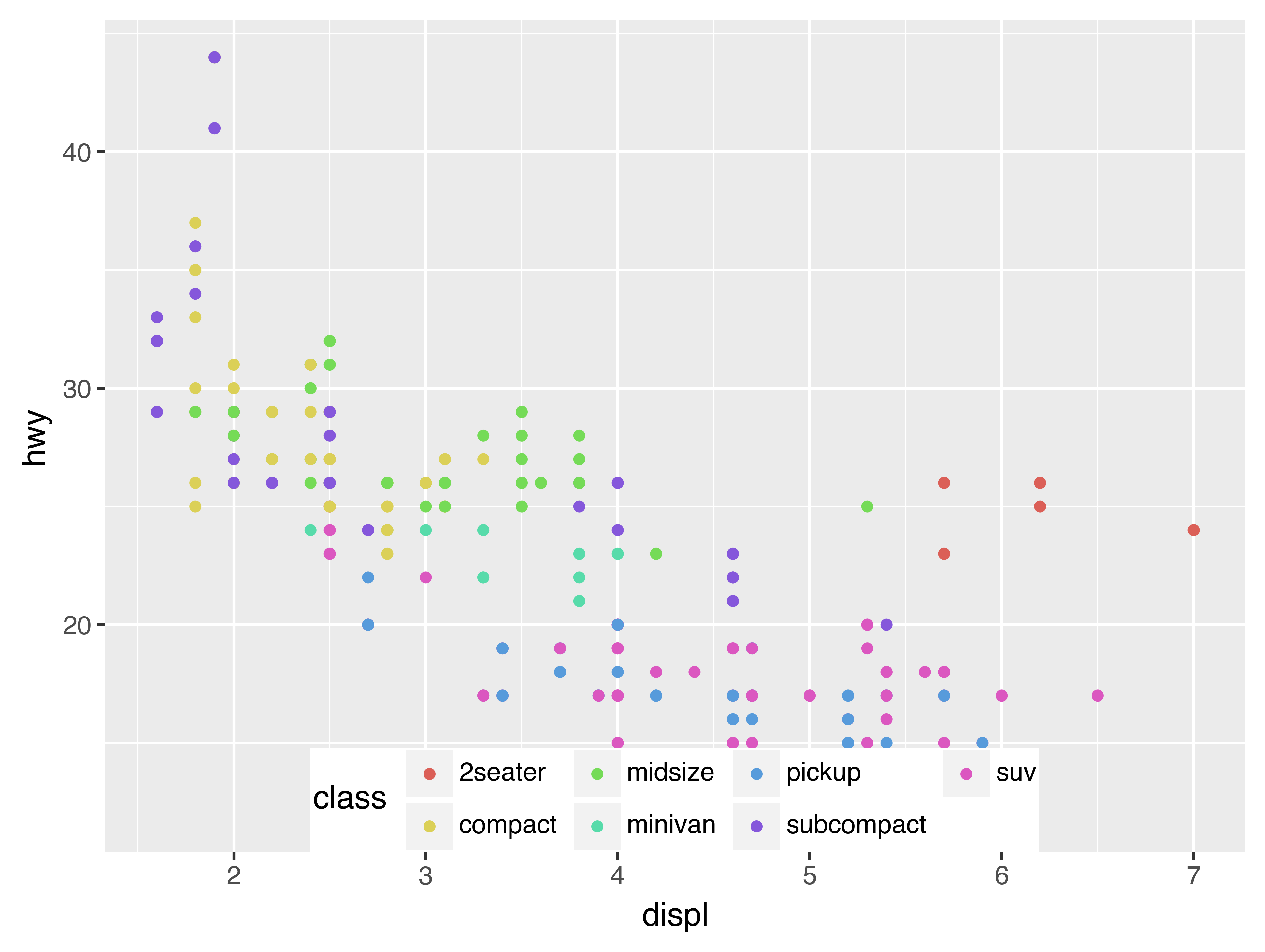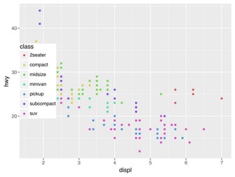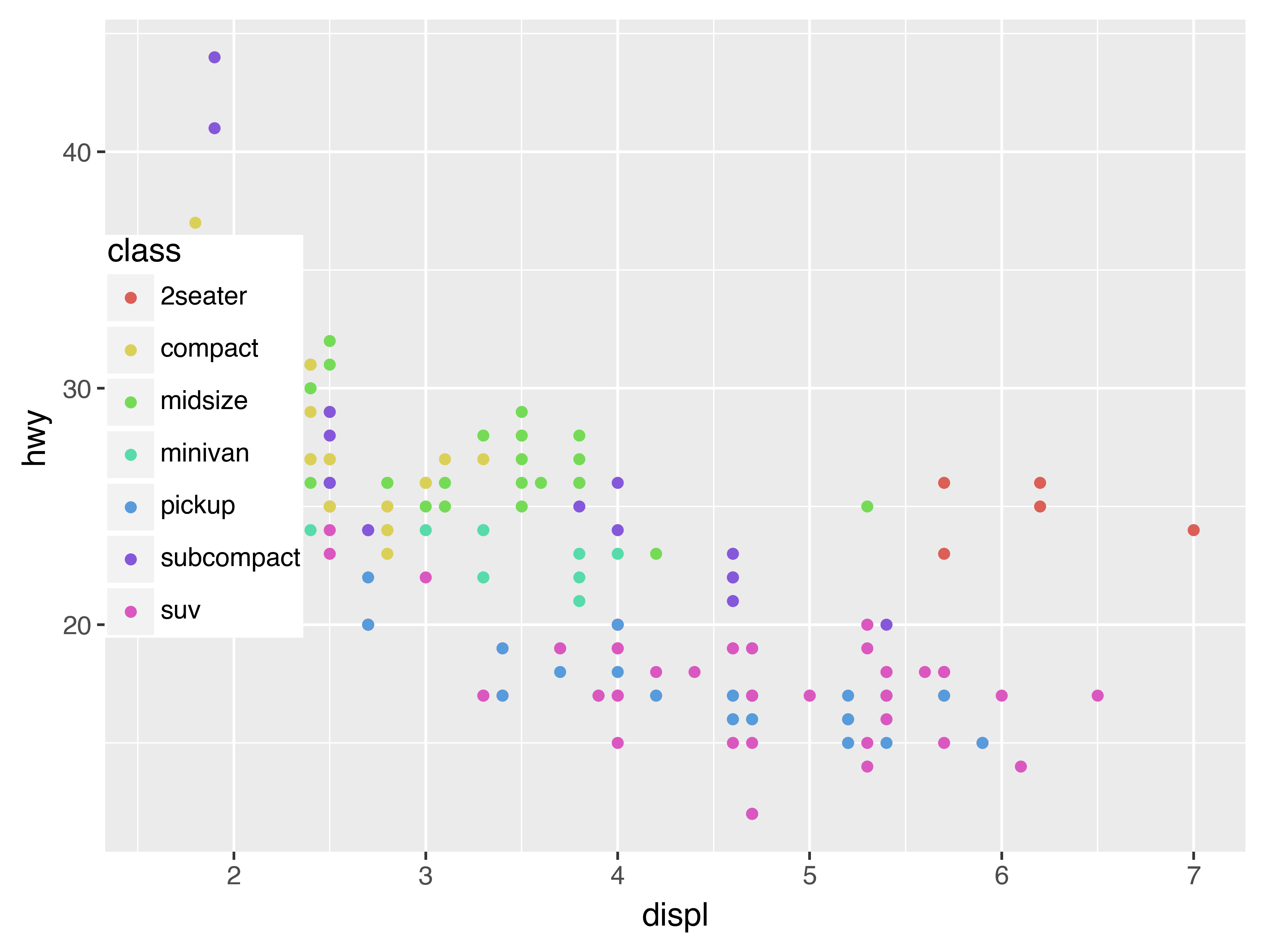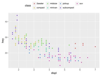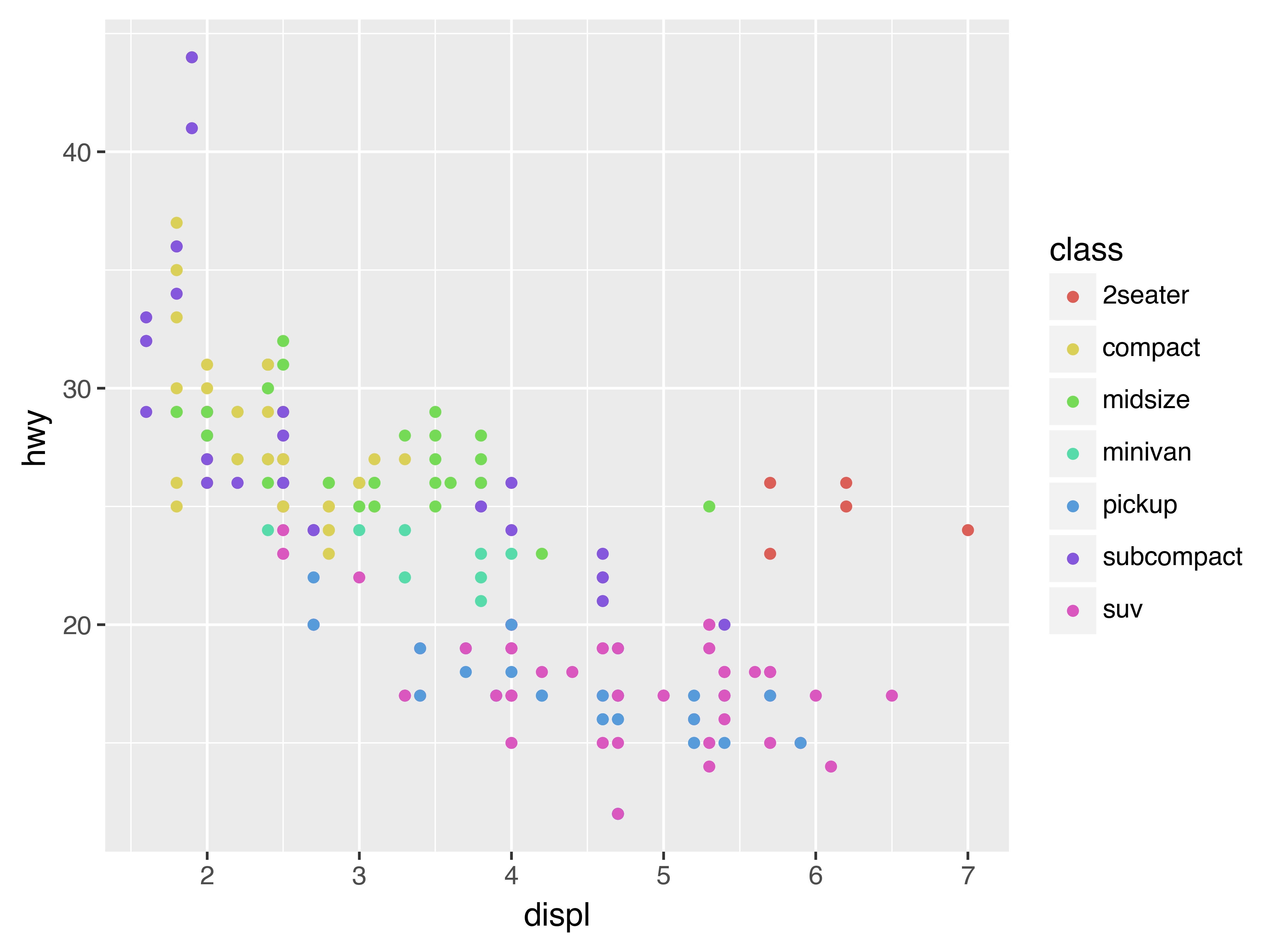 You can convey information about your data by mapping the aesthetics in your plot to the variables in your dataset. For example, you can map the colors of your points to the class variable to reveal the class of each car.