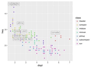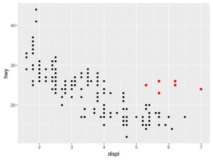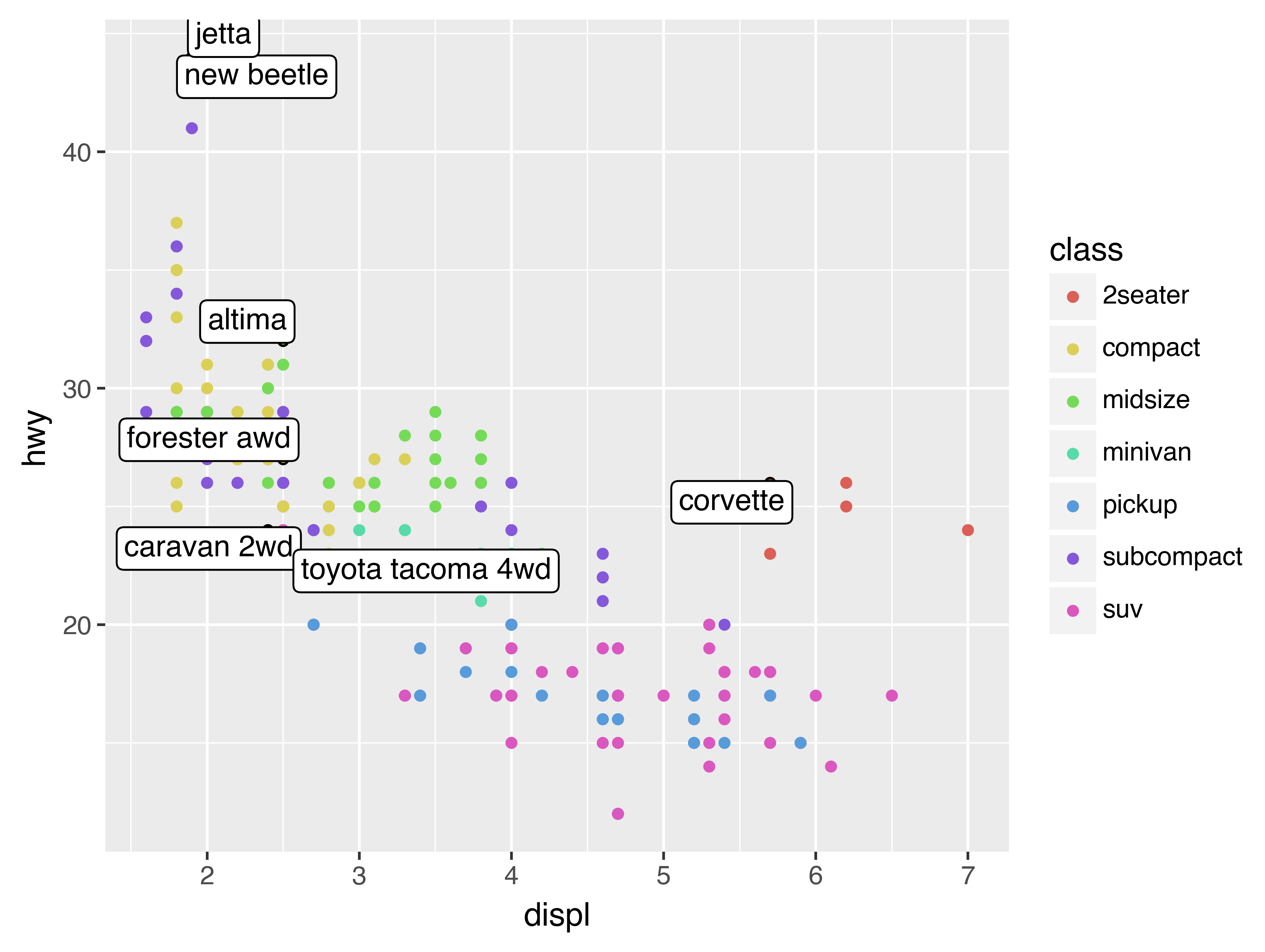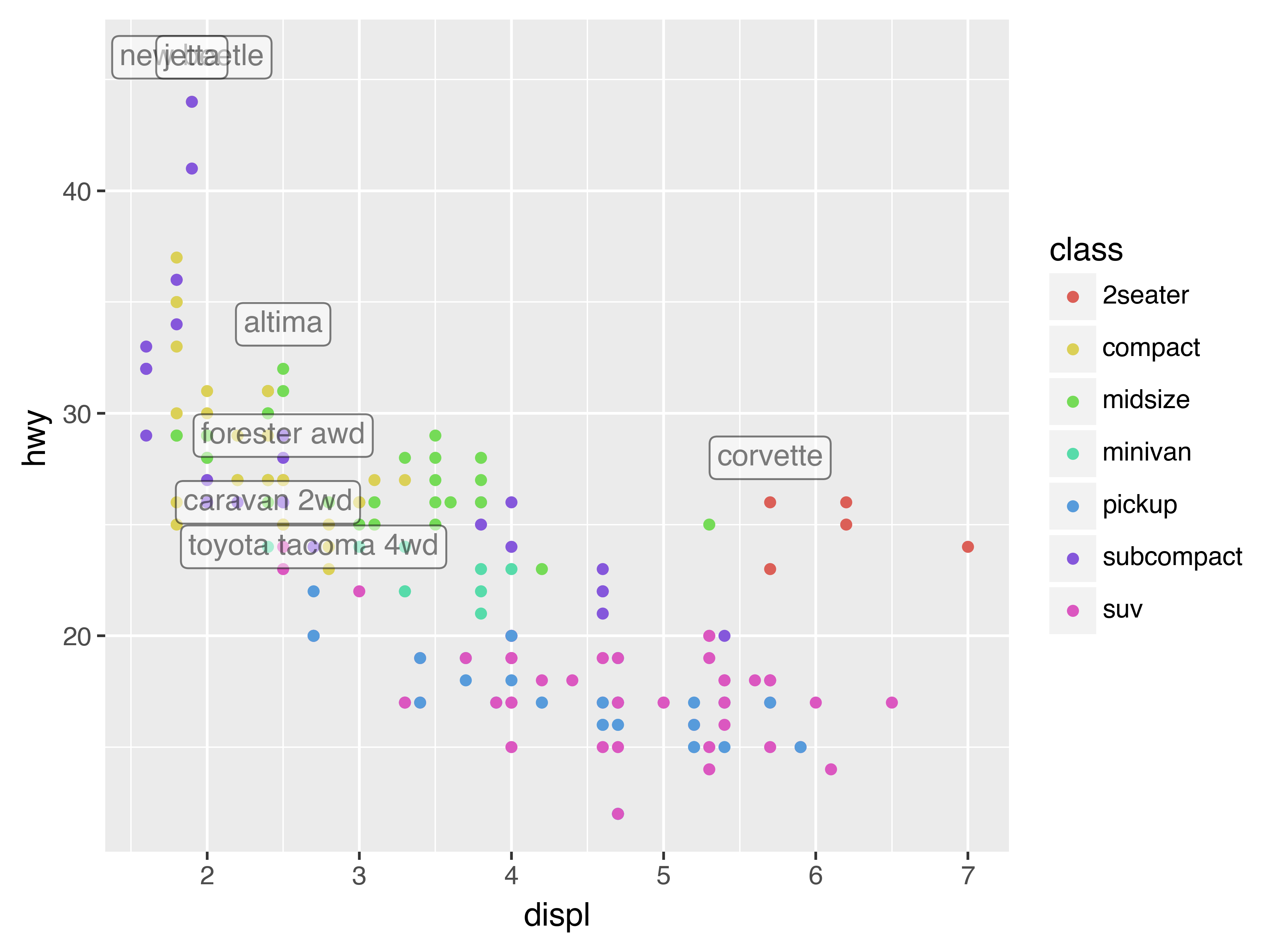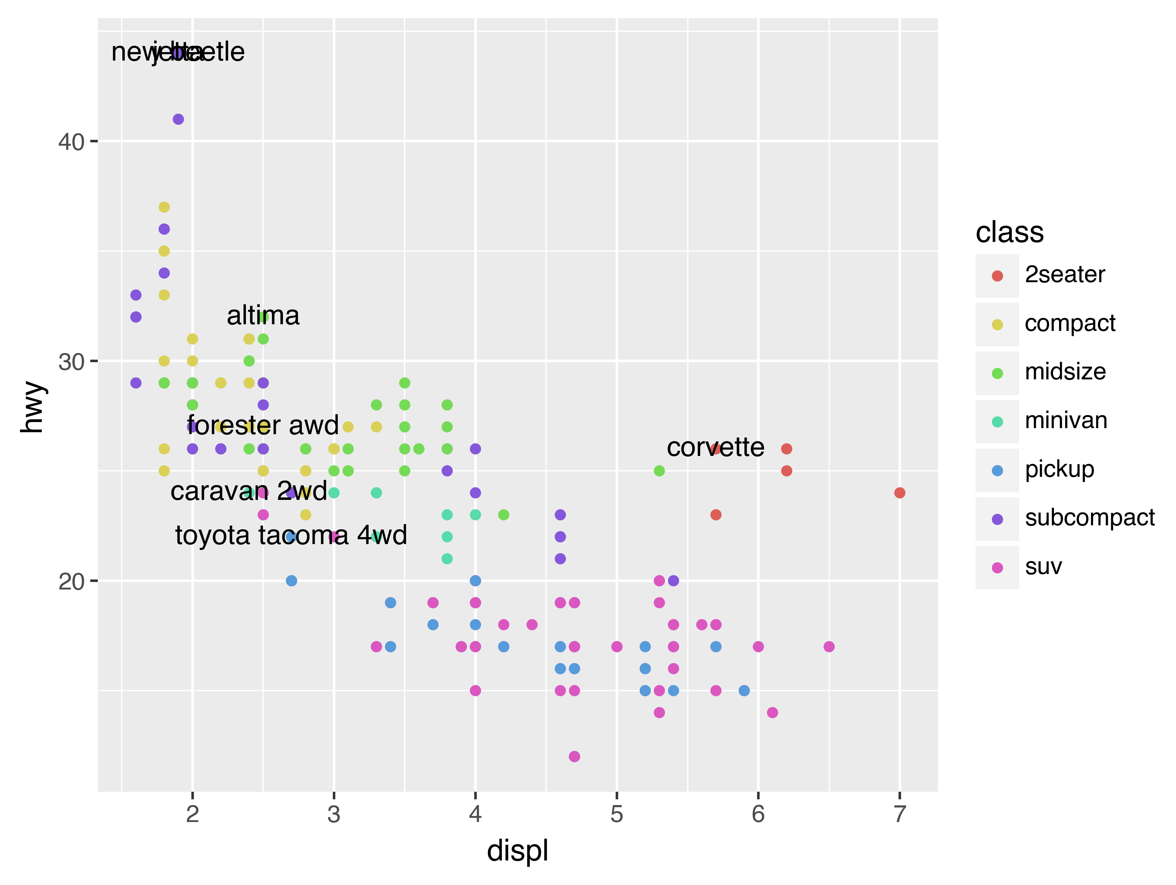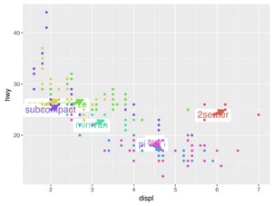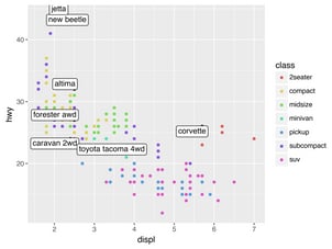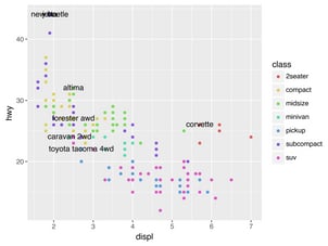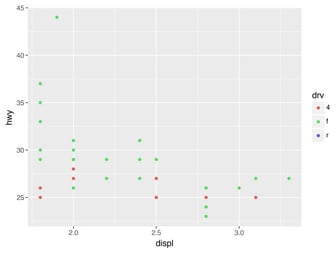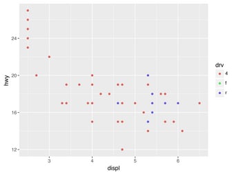 You can convey information about your data by mapping the aesthetics in your plot to the variables in your dataset. For example, you can map the colors of your points to the class variable to reveal the class of each car.