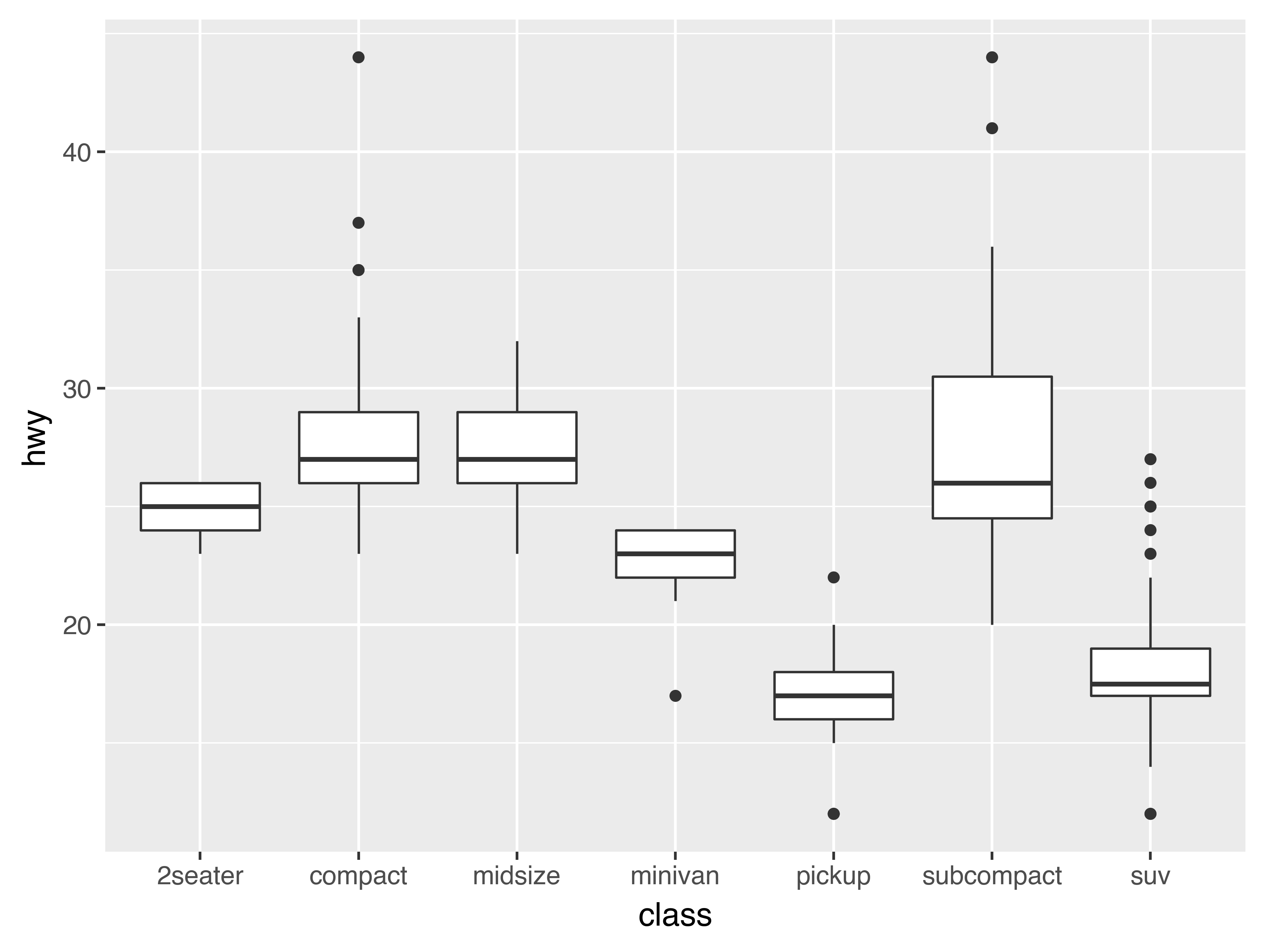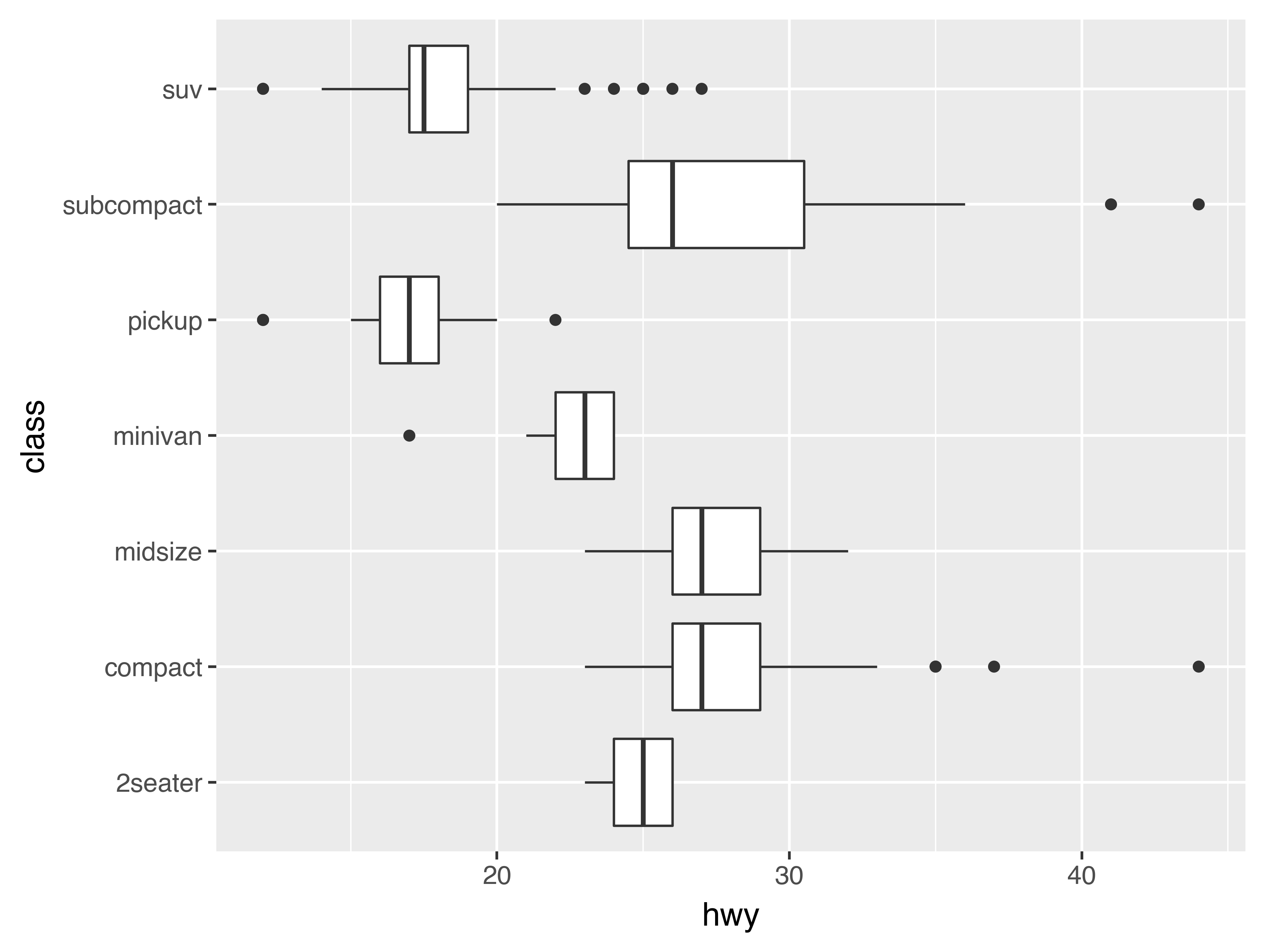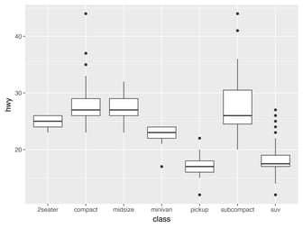 Let’s hypothesize that the cars are hybrids. One way to test this hypothesis is to look at the class value for each car. The class variable of the mpg dataset classifies cars into groups such as compact, midsize, and SUV. If the outlying points are hybrids, they should be classified as compact cars or, perhaps, subcompact cars (keep in mind that this data was collected before hybrid trucks and SUVs became popular).