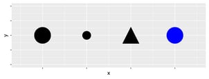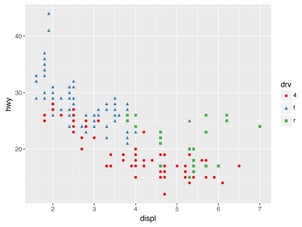 You can add a third variable, like class, to a two dimensional scatterplot by mapping it to an aesthetic. An aesthetic is a visual property of the objects in your plot. Aesthetics include things like the size, the shape, or the color of your points. You can display a point (like the one below) in different ways by changing the values of its aesthetic properties. Since we already use the word “value” to describe data, let’s use the word “level” to describe aesthetic properties. Here we change the levels of a point’s size, shape, and color to make the point small, triangular, or blue: