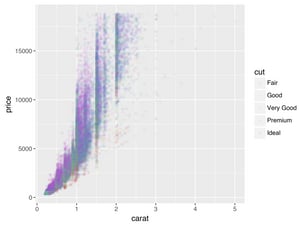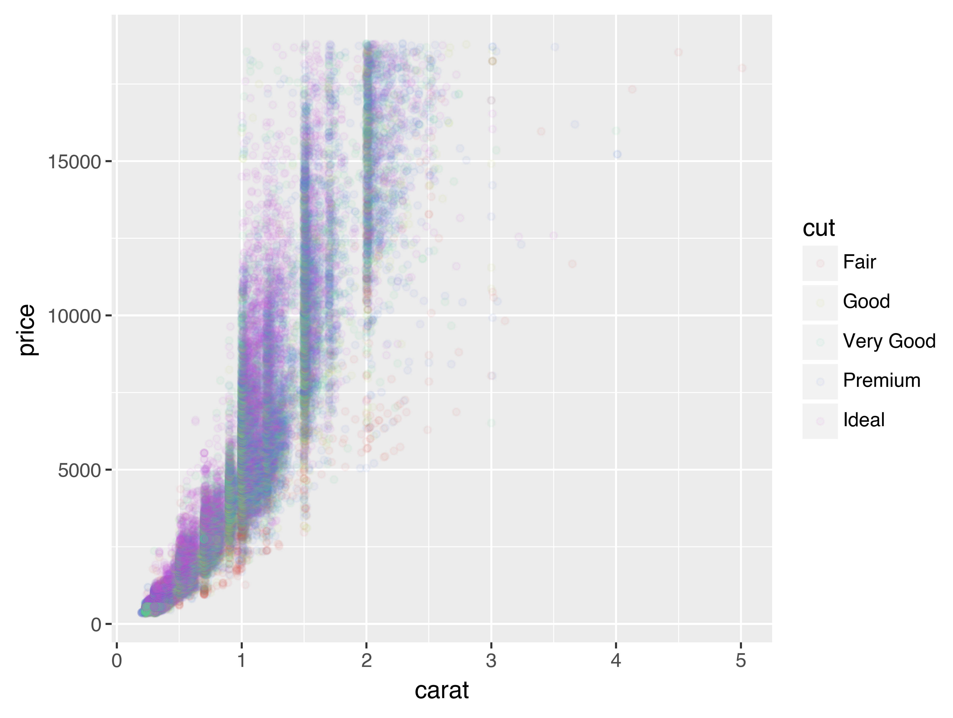 override_aesto make the legend on the following plot easier to see.( ggplot(diamonds, aes("carat", "price")) + geom_point(aes(colour="cut"), alpha=1/20) )