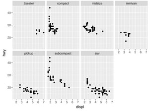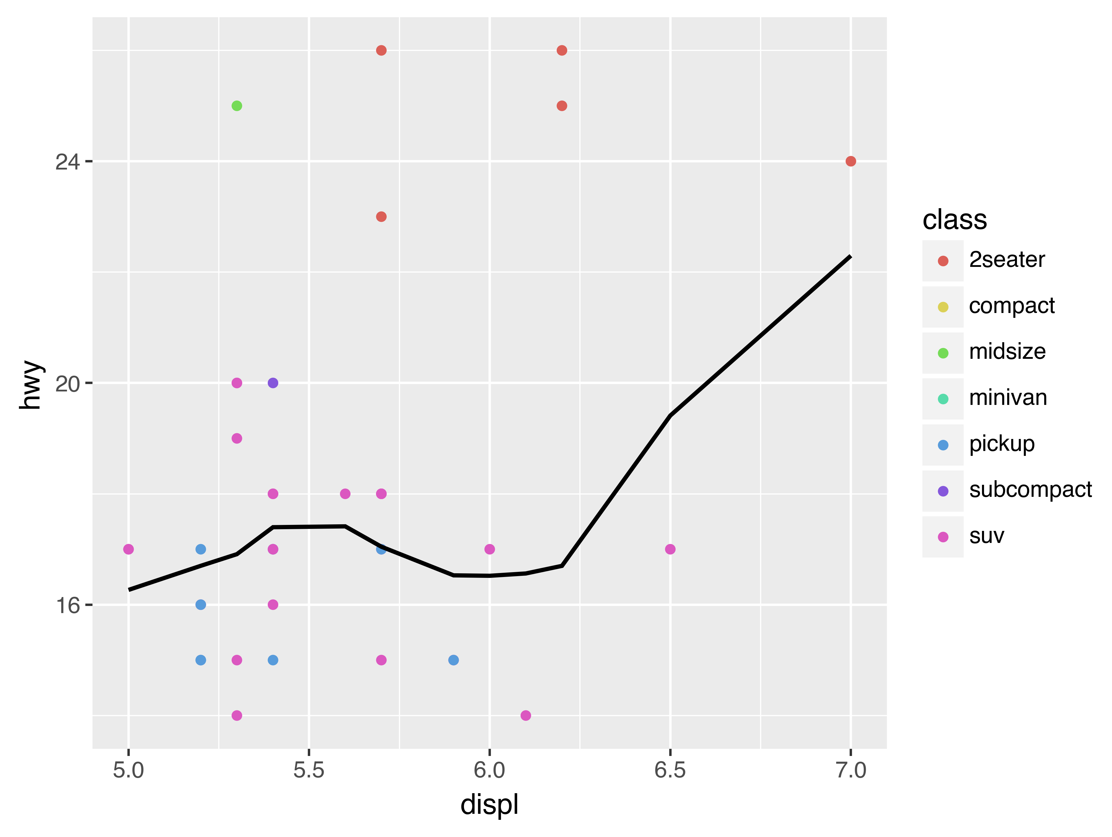 + geom_point(mapping=aes(x="displ", y="hwy", color="class"))