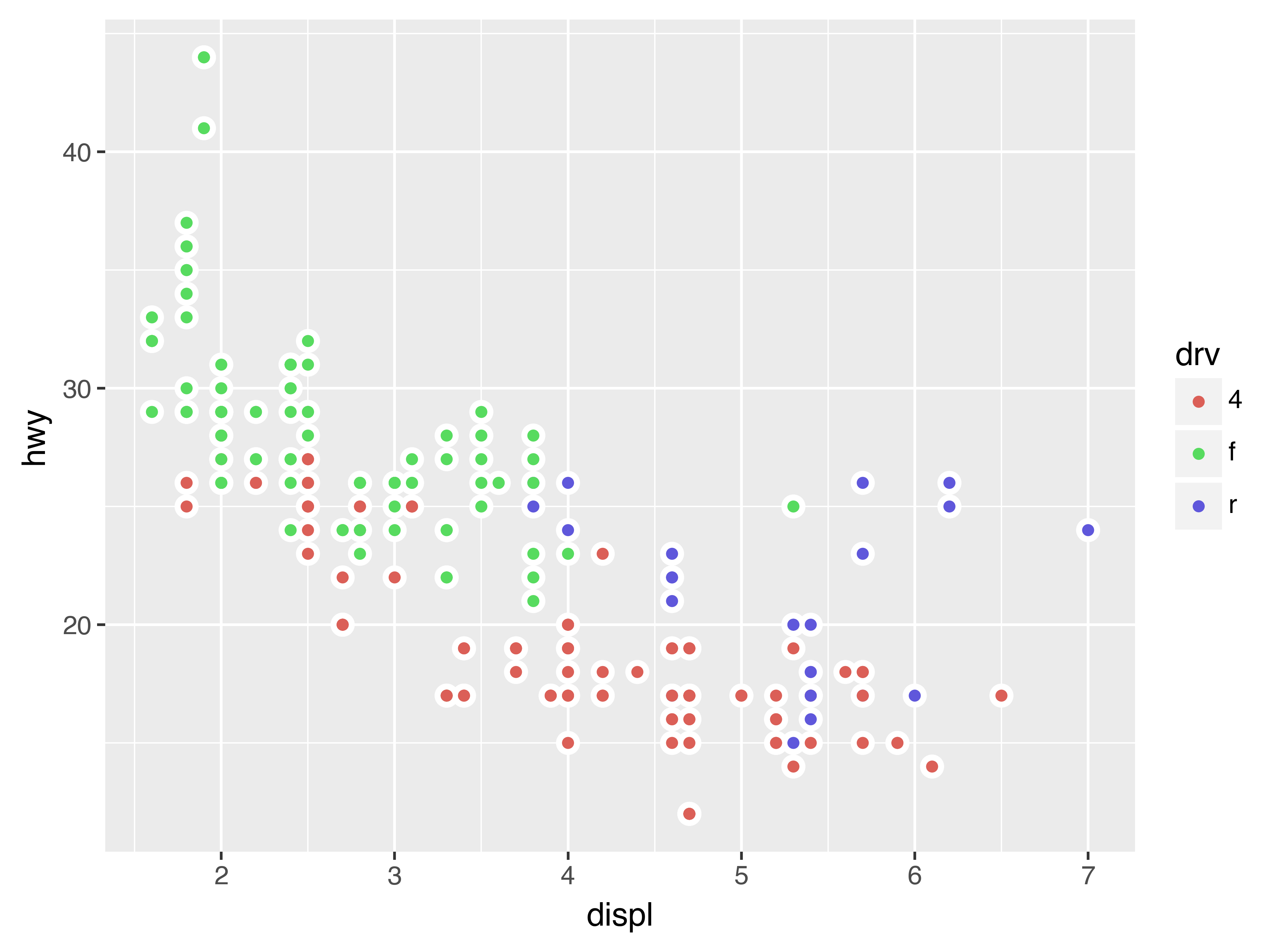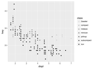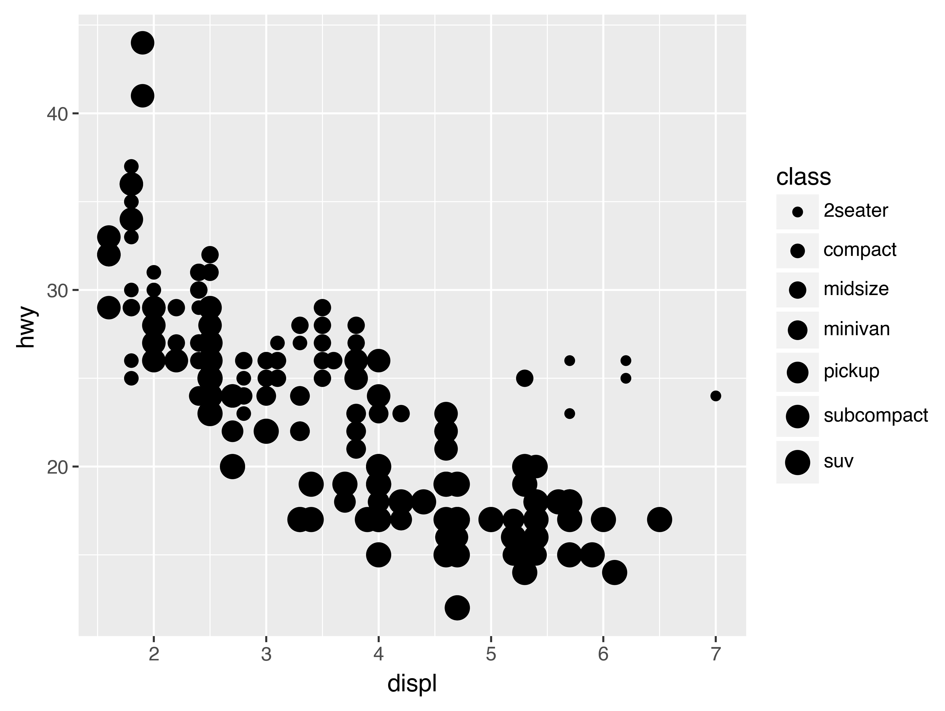 In the above example, we mapped class to the color aesthetic, but we could have mapped class to the size aesthetic in the same way. In this case, the exact size of each point would reveal its class affiliation. We get a warning here, because mapping an unordered variable (class) to an ordered aesthetic (size) is not a good idea.