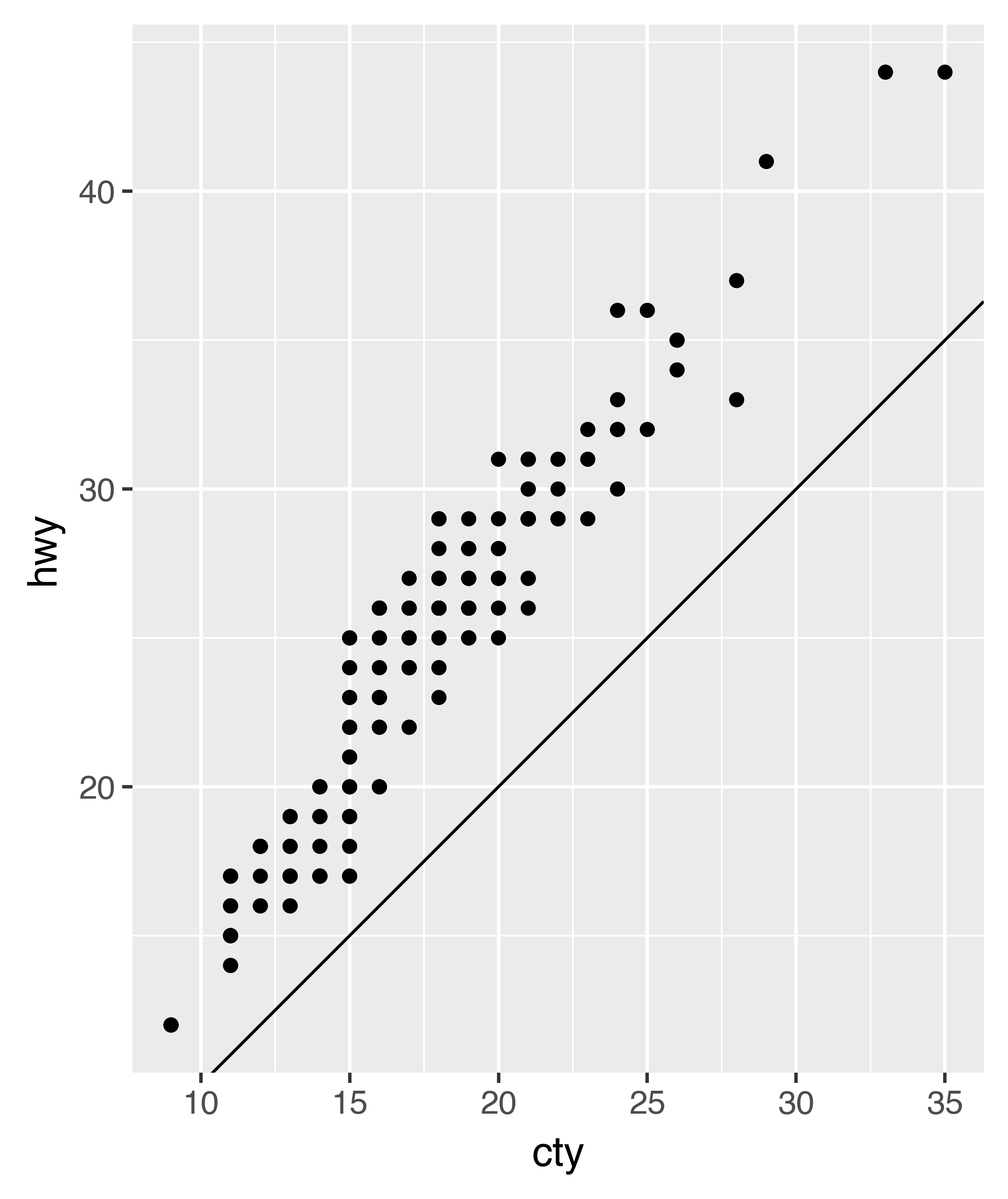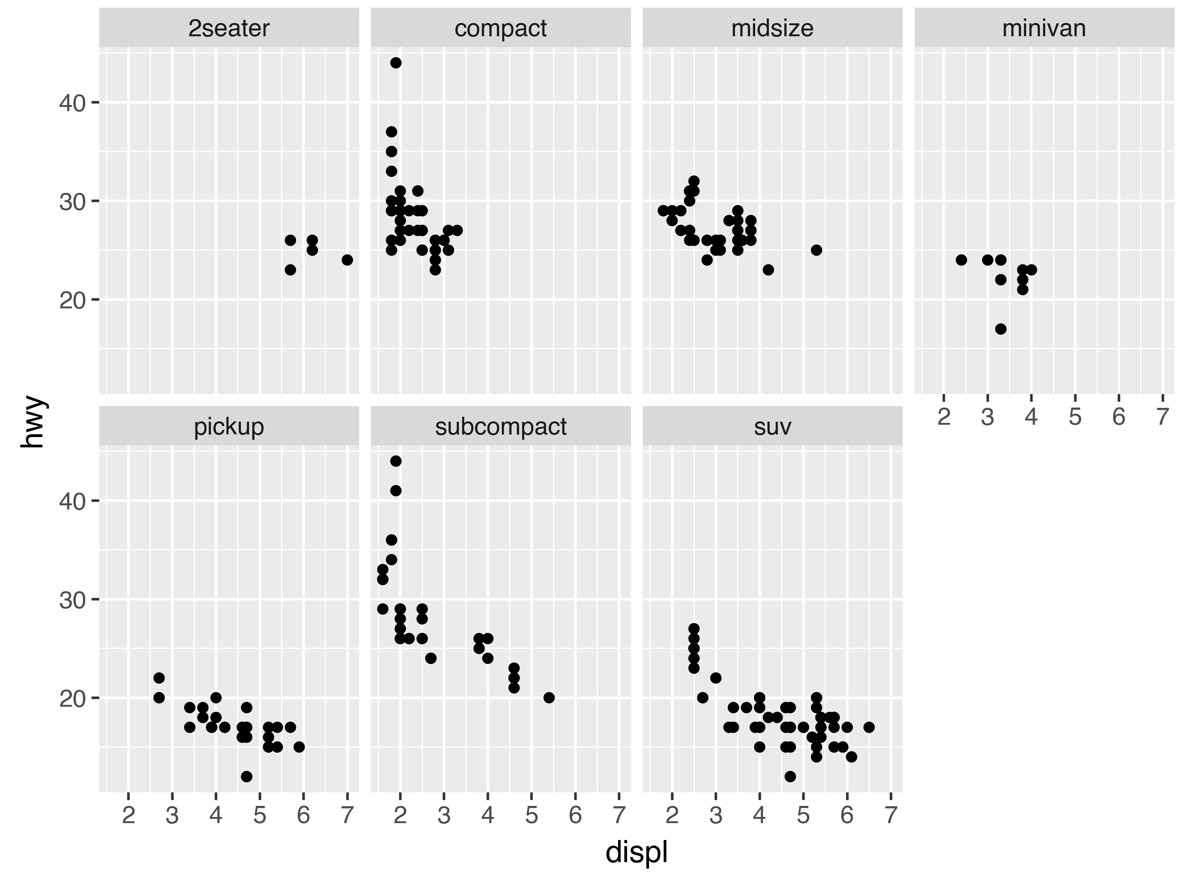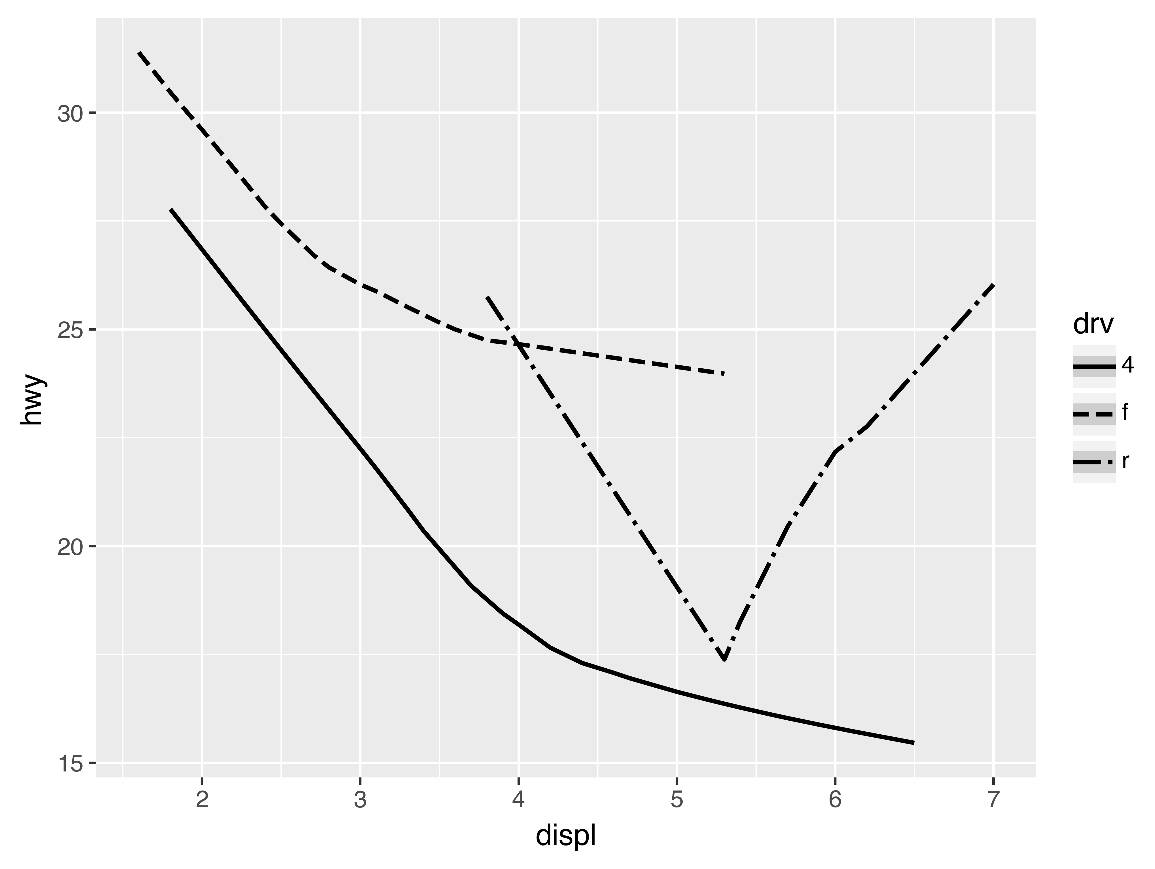 Many people wonder why the default theme has a grey background. This was a deliberate choice because it puts the data forward while still making the grid lines visible. The white grid lines are visible (which is important because they significantly aid position judgements), but they have little visual impact and we can easily tune them out. The grey background gives the plot a similar typographic colour to the text, ensuring that the graphics fit in with the flow of a document without jumping out with a bright white background. Finally, the grey background creates a continuous field of colour which ensures that the plot is perceived as a single visual entity.