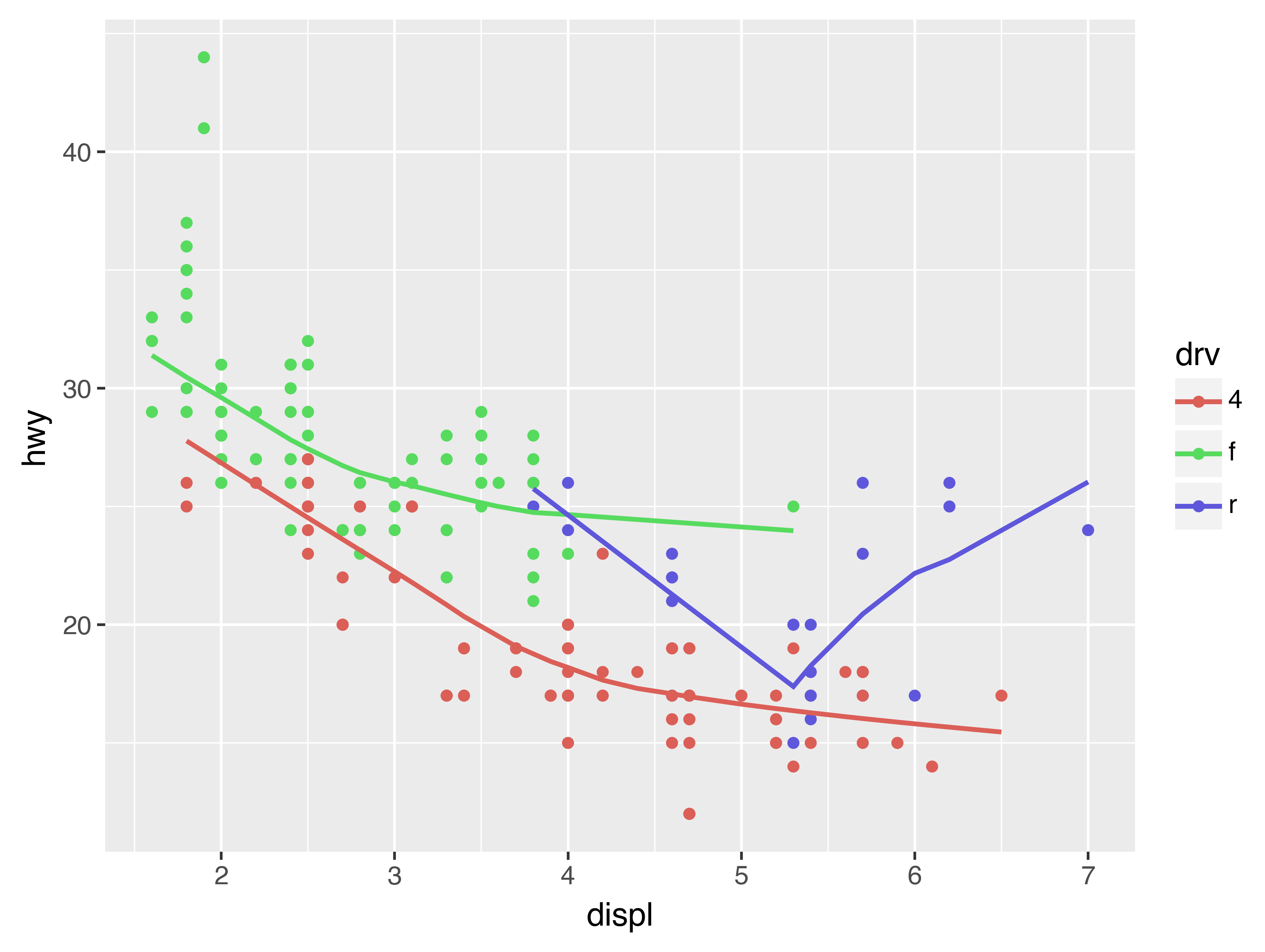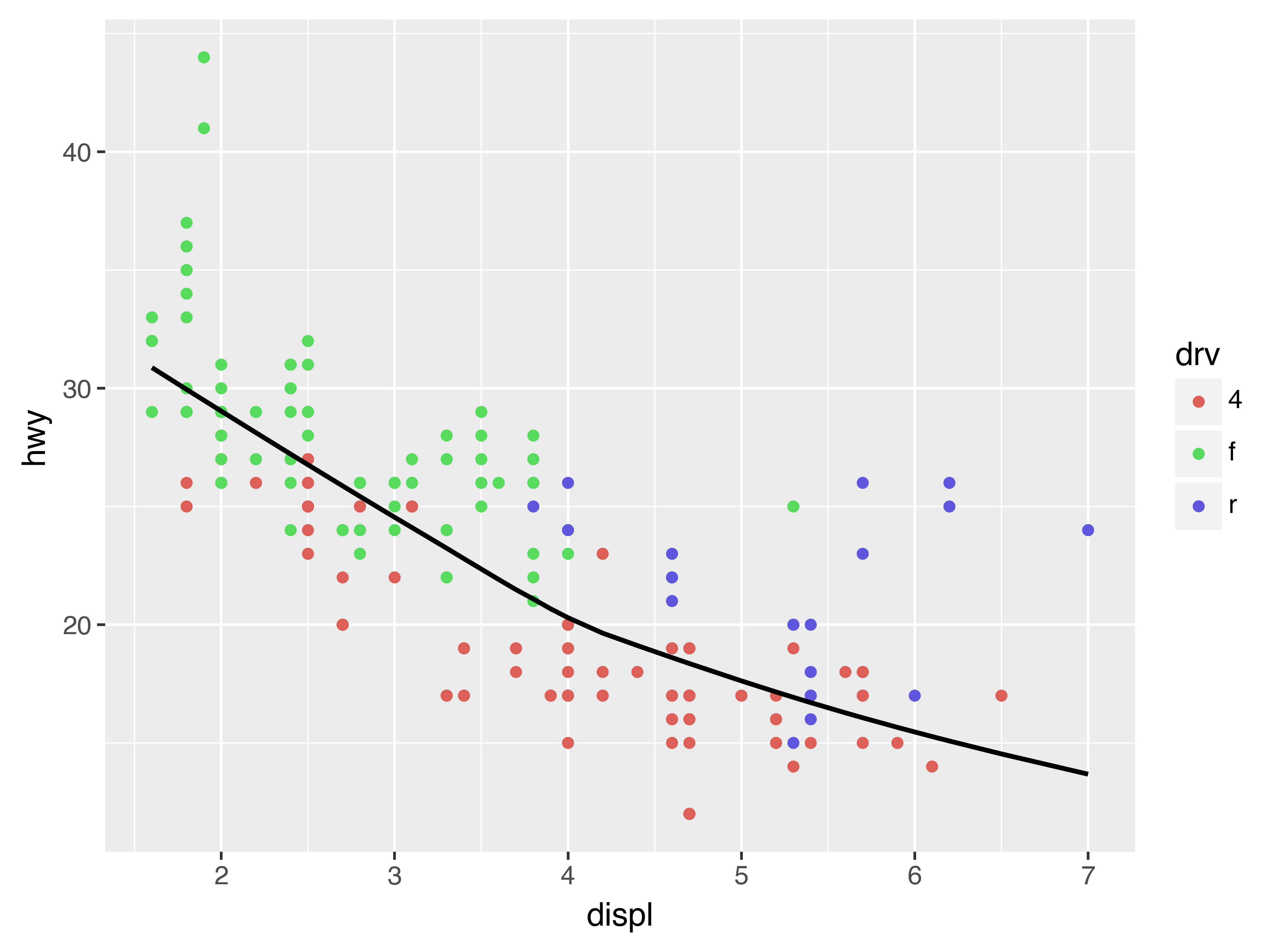ggplot(compact, aes("displ", "hwy", colour="drv"))