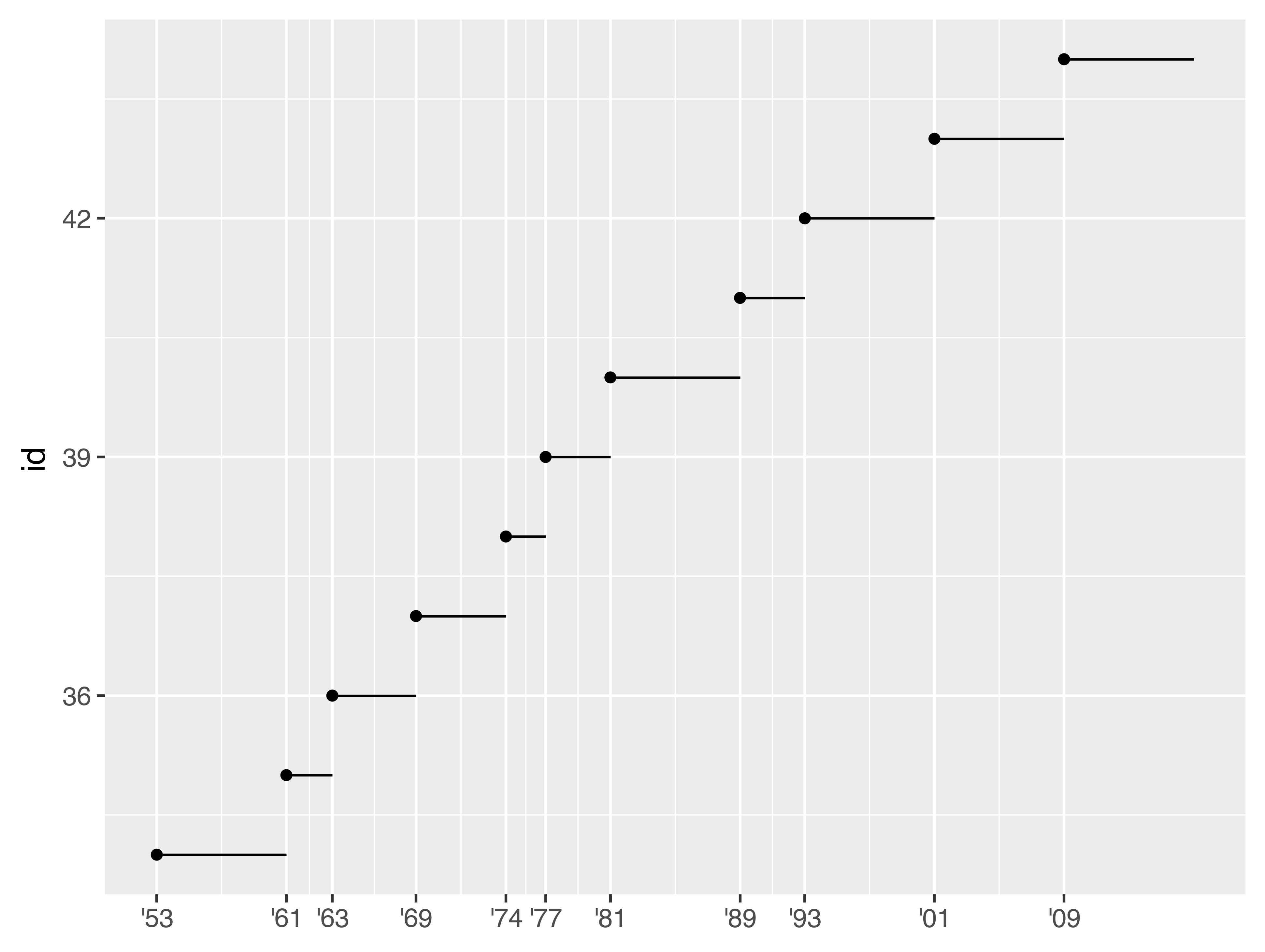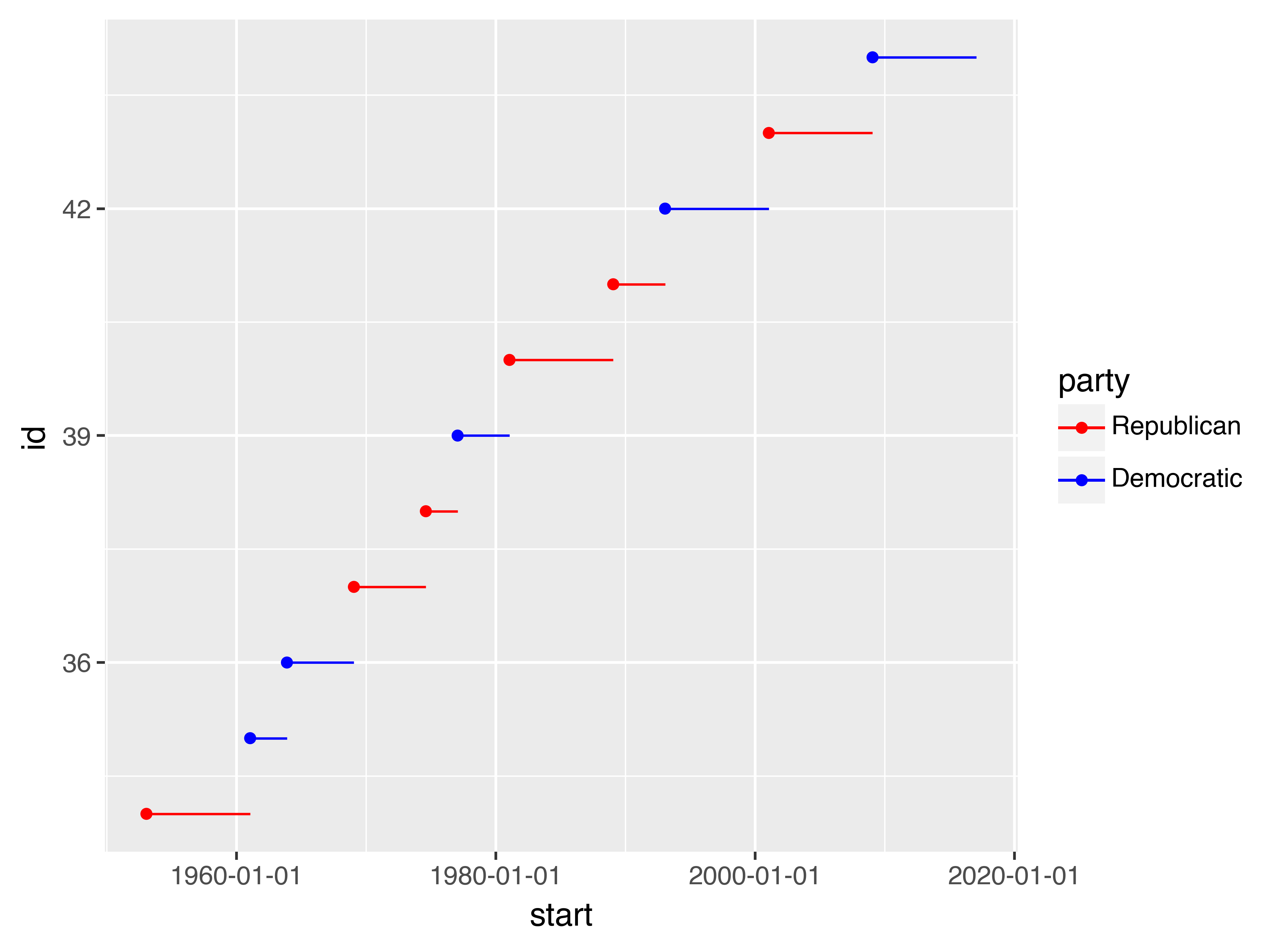 When you have a predefined mapping between values and colours, use scale_colour_manual(). For example, if we map presidential party to colour, we want to use the standard mapping of red for Republicans and blue for Democrats: