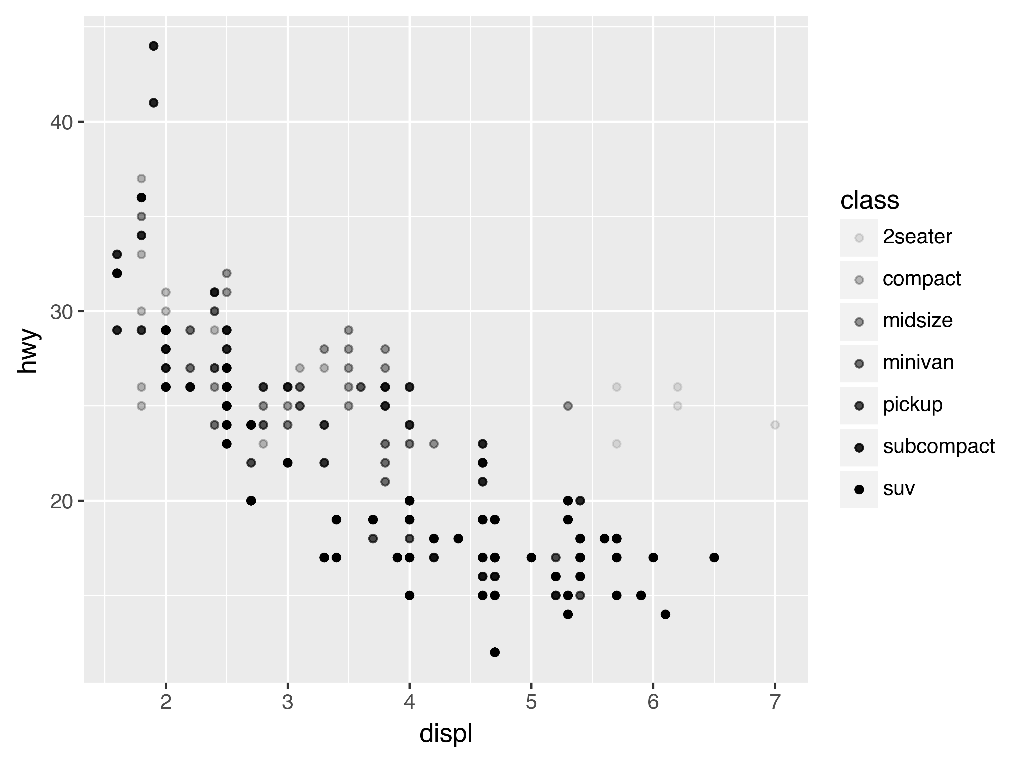 Similarly, we could have mapped class to the alpha aesthetic, which controls the transparency of the points.