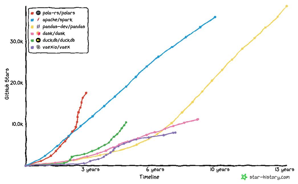 Polars is a highly performant DataFrame library for manipulating structured data. The core is written in Rust, and the library is officially available in Python, Rust, NodeJS, R, and SQL. Its three key selling points are: