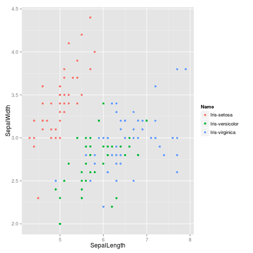 $ < iris.csv Rio -ge 'g + geom_point(aes(x = SepalLength, y = SepalWidth, colour = Name))' > iris.png