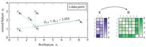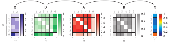 The right part of the figure shows that the feature matrix X is transformed into a dissimilarity matrix D using the Euclidean distance. (Any dissimilarity measure could have been used here.) Using the dissimilarity matrix D, SOS computes an affinity matrix A, a binding probability matrix B, and finally, the outlier probability vector Φ, because Greek letters are cool.