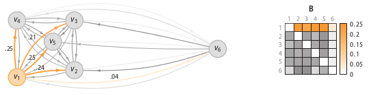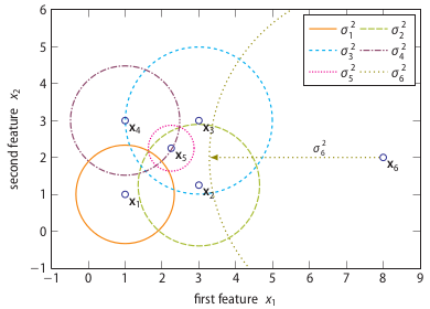 Perplexity can be interpreted as the k in k-nearest neighbour algorithms. The difference is that in SOS being a neighbour is not a binary property, but a probabilistic one. The following figure illustrates the binding probabilities data point x1 (or vertex v1 because we have switched to a graph representation of the dataset) has with the other five data points.