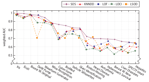 SOS has been evaluated on a variety of real-world and synthetic datasets, and compared to four other outlier-selection algorithms. The following figure shows the weighted AUC performance on 18 real-world datasets.