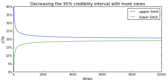 The frequentist approach doesn’t provide an easy answer to the first question because the statistical test assumes that the number of views are fixed before we start a headline test. Furthermore, we cannot run a headline test until we see a significant difference between CTRs as this would falsely increase the probability of obtaining a significant result, as Evan Miller explains on his blog. We would have to estimate how many views we would need in order to obtain a significant difference.
