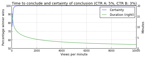 Below are two figures that show how long it takes to conclude and the amount of certainty associated to that conclusion. In the first figure, the CTRs of both headlines are kept constant (CTR A=5%, CTR B=3%), and the views per minute (VPM) varies from 10 to 10,000. In the second figure, the VPM (=1000) and the CTR of headline A (=5%) are kept constant and the CTR of headline B varies from 0% to 10%.