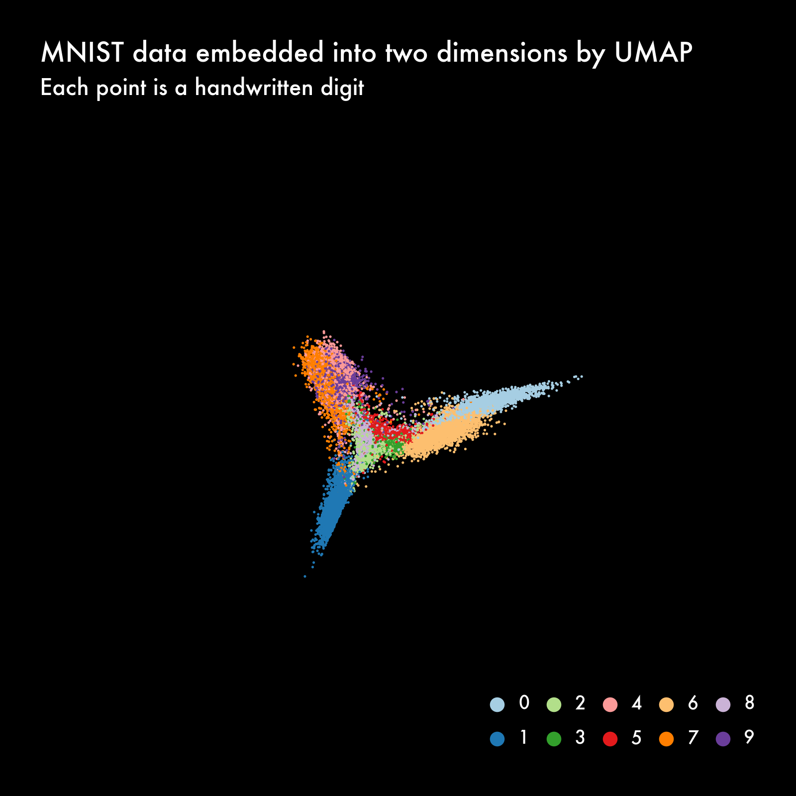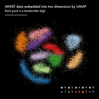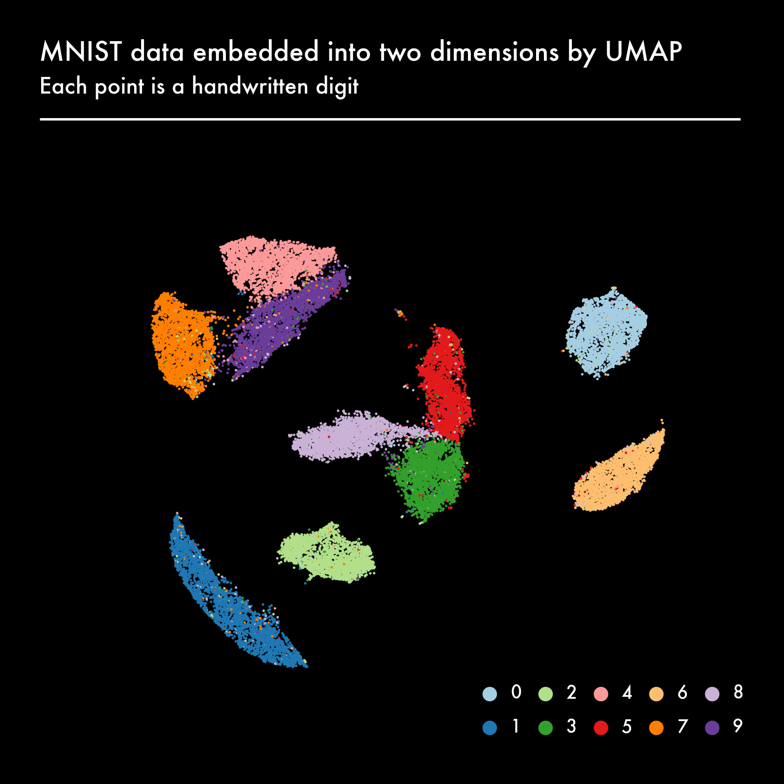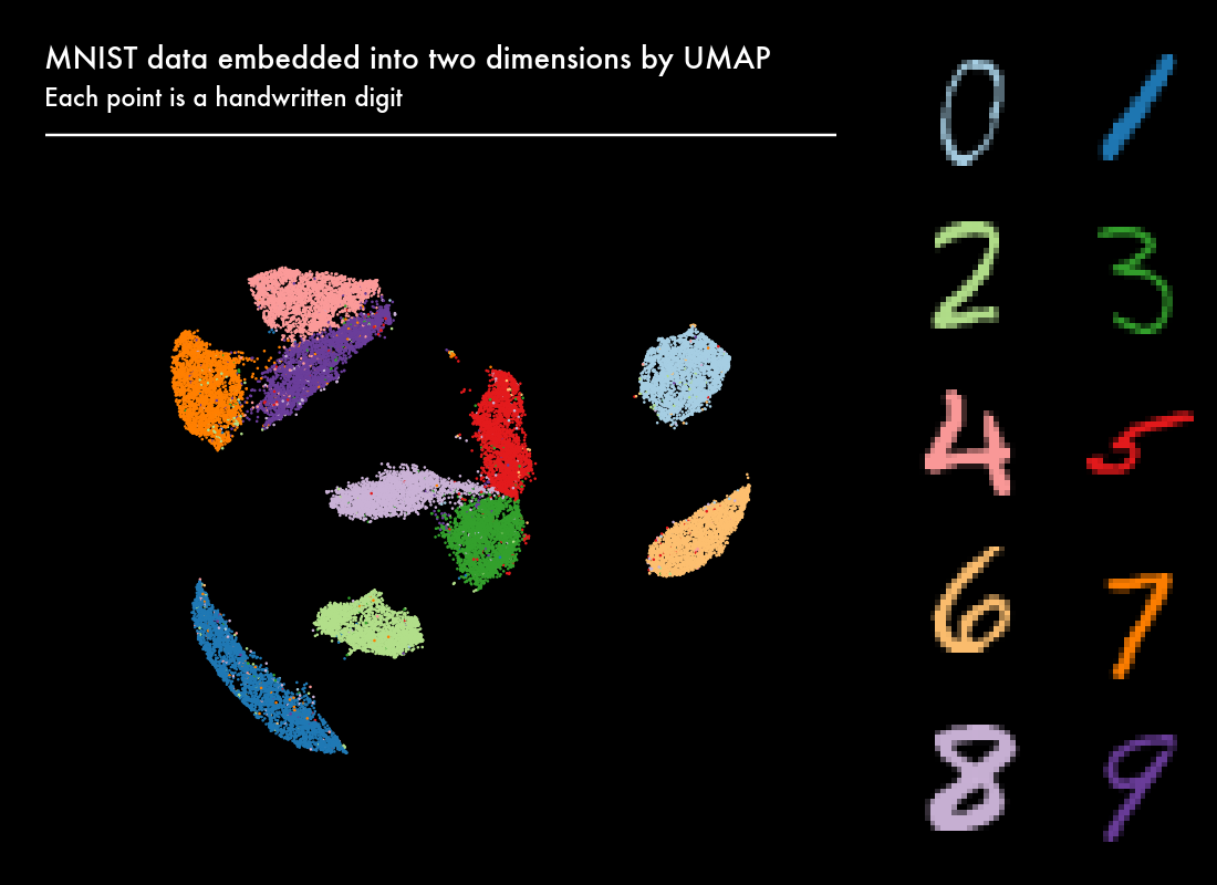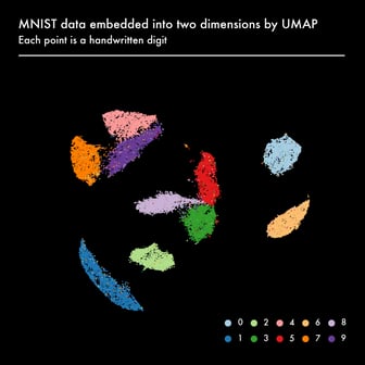 In this post we’re going to apply UMAP to the MNIST dataset, a collection of 70,000 handwritten digits. Each digit is an image of 28 by 28 grayscale pixels, making the dimensionality of the dataset 784. UMAP will embed this dataset into two dimensions, allowing us to understand its structure.